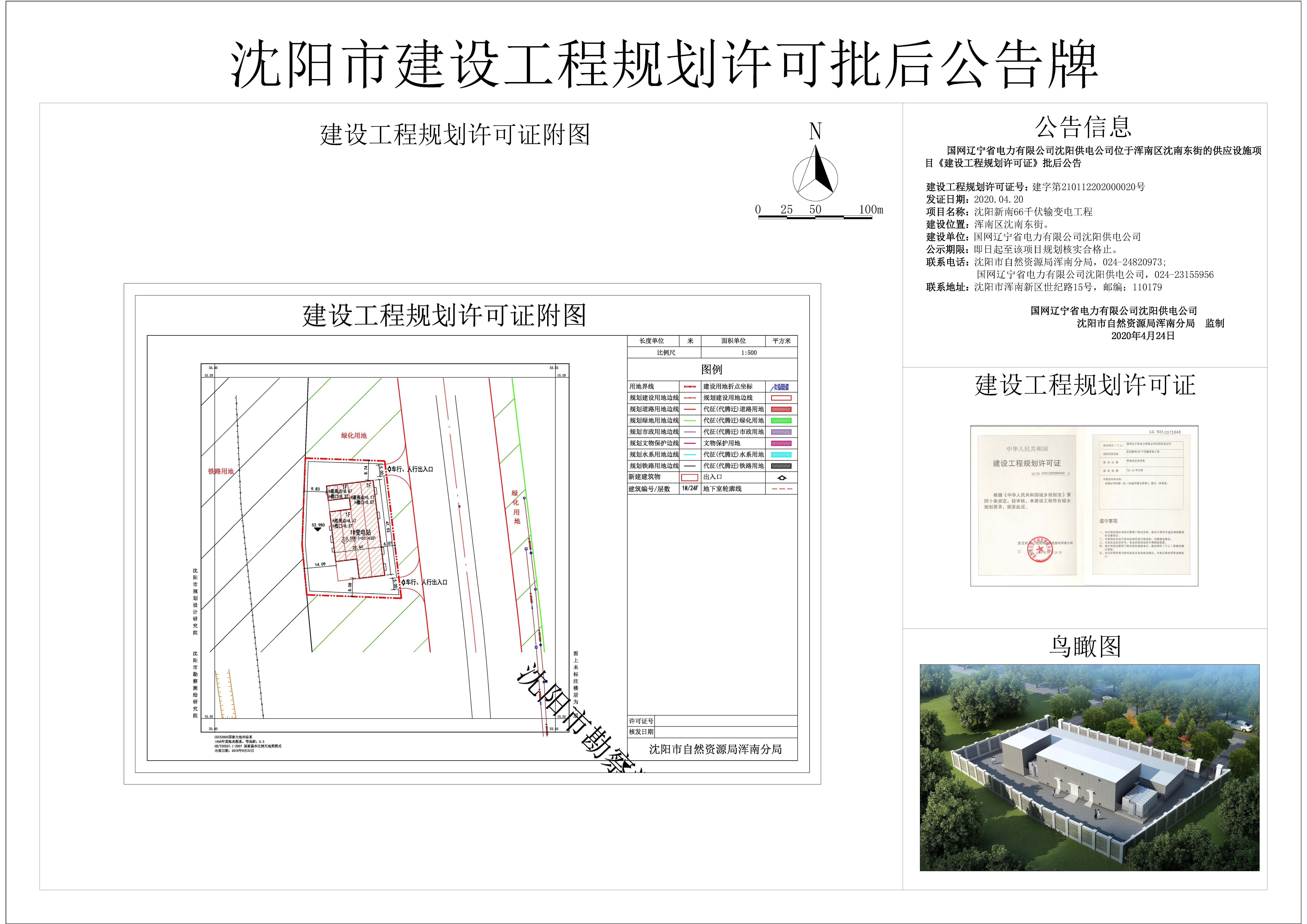 建设工程规划许可证号:建字第210112202000020号 发证日期:2020.04.20 项目名称:沈阳新南66千伏输变电工程 建设位置:浑南区沈南东街。 建设单位:国网辽宁省电力有限公司沈阳供电公司 公示期限:即日起至该项目规划核实合格止。 联系电话:沈阳市自然资源局浑南分局,024-24820973; 国网辽宁省电力有限公司沈阳供电公司,024-23155956 联系地址:沈阳市浑南新区世纪路15号,邮编:110179
