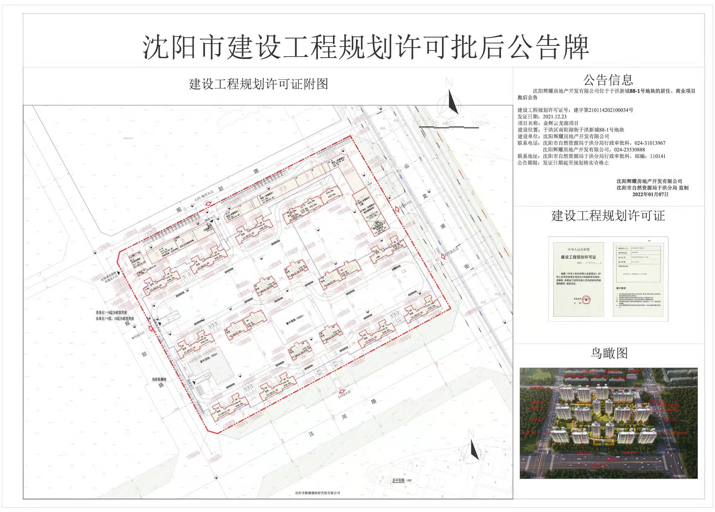 建设工程规划许可证号:建字第210114202100034号 发证日期:2021.12.23 项目名称:金辉云龙湖项目 建设位置:于洪区南阳湖街于洪新城88-1号地块 建设单位:沈阳辉耀房地产开发有限公司 联系电话:沈阳市自然资源局于洪分局行政审批科,024-31013967 沈阳辉耀房地产开发有限公司,024-23530888 联系地址:沈阳市自然资源局于洪分局行政审批科,邮编:110141 公告期限:发证日期起至规划核实合格止