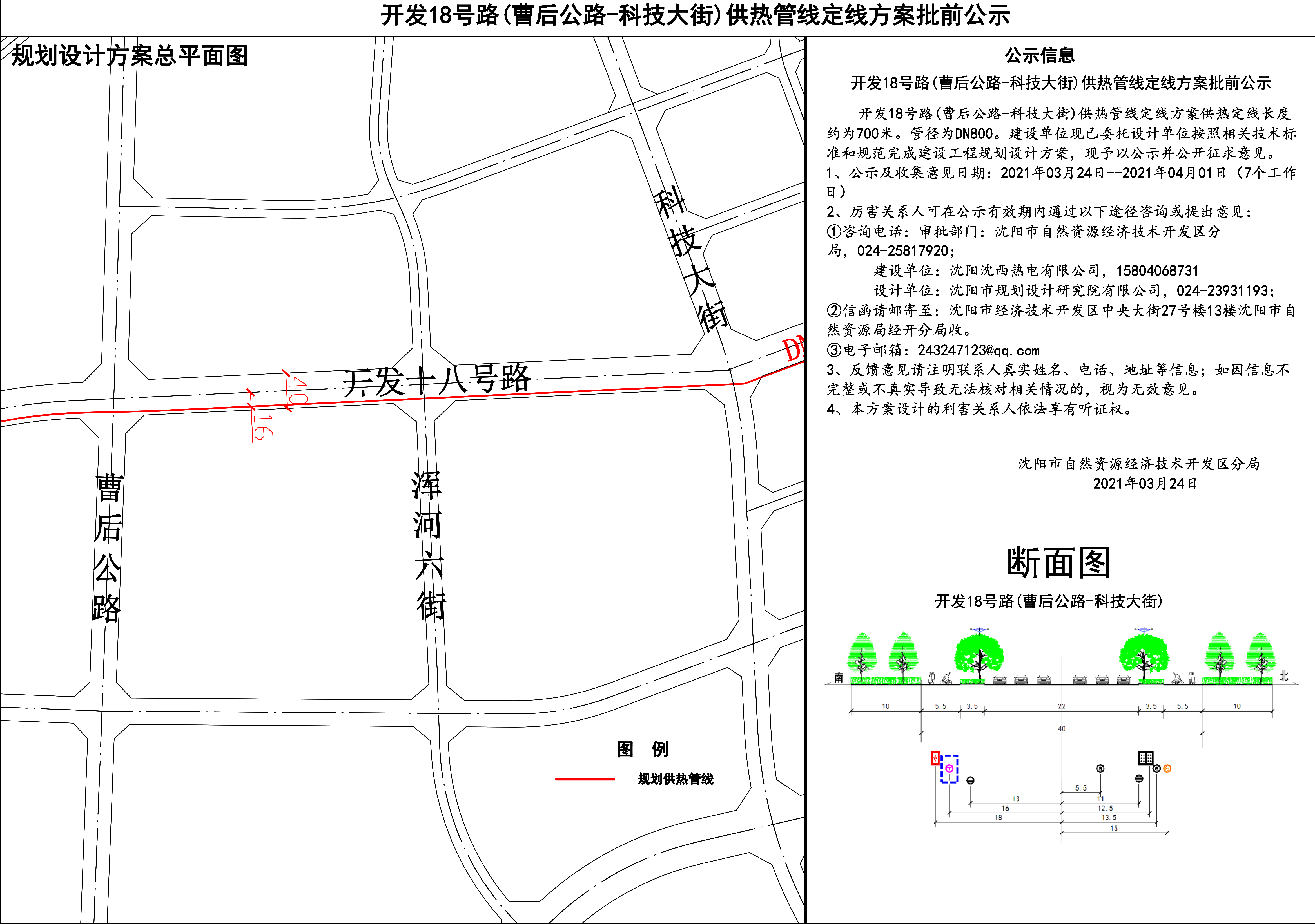 拟由沈阳沈西热电有限公司施工开发的开发十八号路(曹后公路-科技大街)供热管线定线方案批前公示 拟由沈阳沈西热电有限公司施工开发的开发十八号路(曹后公路-科技大街)供热管线定线方案供热定线长度700米,管径为DN800。建设单位现已委托设计单位按照相关技术标准和规范完成建设工程规划设计方案,现予以公示并公开征求意见。 1、公示及收集意见日期:2021年3月24日——2021年4月1日(7个工作日) 2、利害关系人可在公示有效期内通过以下途径咨询或提出意见:①咨询电话:审批部门:沈阳市自然资源局经济技术开发区分局,024-25817920; 建设单位:沈阳沈西热电有限公司,15804068731; 设计单位:沈阳市规划设计研究院有限公司,024-23931193; ②信函请邮寄至:沈阳市经济技术开发区中央大街27号13楼沈阳市自然资源局经开分局收。 ③电子邮箱:243247123@qq.com。 3、反馈意见请注明联系人真实姓名、电话、地址等信息;如因信息不完整或不真实导致无法核对相关情况的,视为无效意见。 4、本方案涉及的利害关系人依法享有听证权。