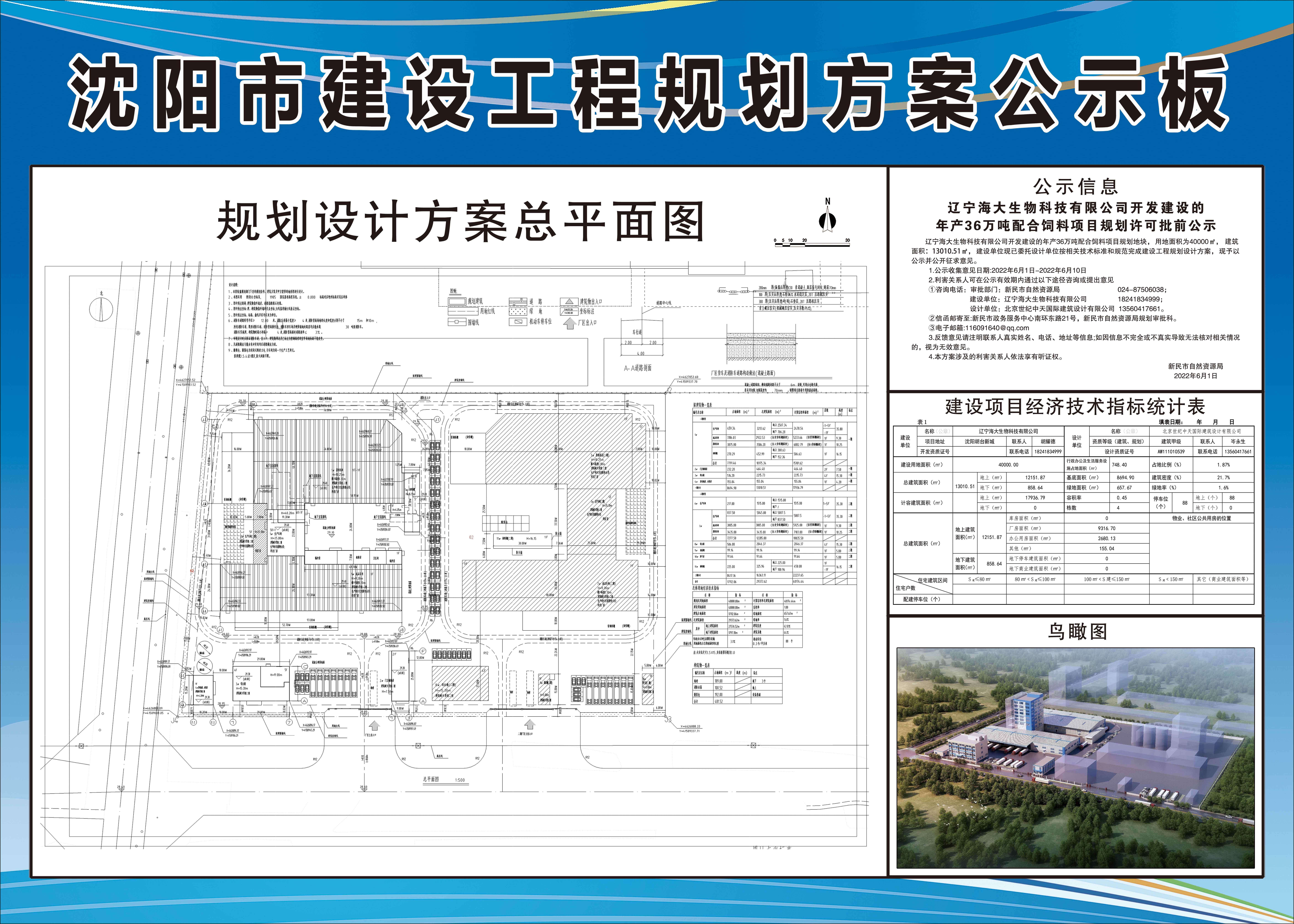 公示信息 辽宁海大生物科技有限公司开发建设的年产36万吨配合饲料项目规划许可批前公示 辽宁海大生物科技有限公司开发建设的年产36万吨配合饲料项目规划地块,用地面积为40000㎡,建筑面积:13010.51㎡,建设单位现已委托设计单位按相关技术标准和规范完成建设工程规划设计方案,现予以公示并公开征求意见。 1.公示收集意见日期:2022年6月1日-2022年6月10日 2.利害关系人可在公示有效期内通过以下途径咨询或提出意见 ①咨询电话:审批部门:新民市自然资源局 024-87506038; 建设单位:辽宁海大生物科技有限公司 18241834999; 设计单位:北京世纪中天国际建筑设计有限公司 13560417661。 ②信函邮寄至:新民市政务服务中心南环东路21号,新民市自然资源局规划审批科。 ③电子邮箱:116091640@qq.com 3.反馈意见请注明联系人真实姓名、电话、地址等信息;如因信息不完全或不真实导致无法核对相关情况的,视为无效意见。 4.本方案涉及的利害关系人依法享有听证权。