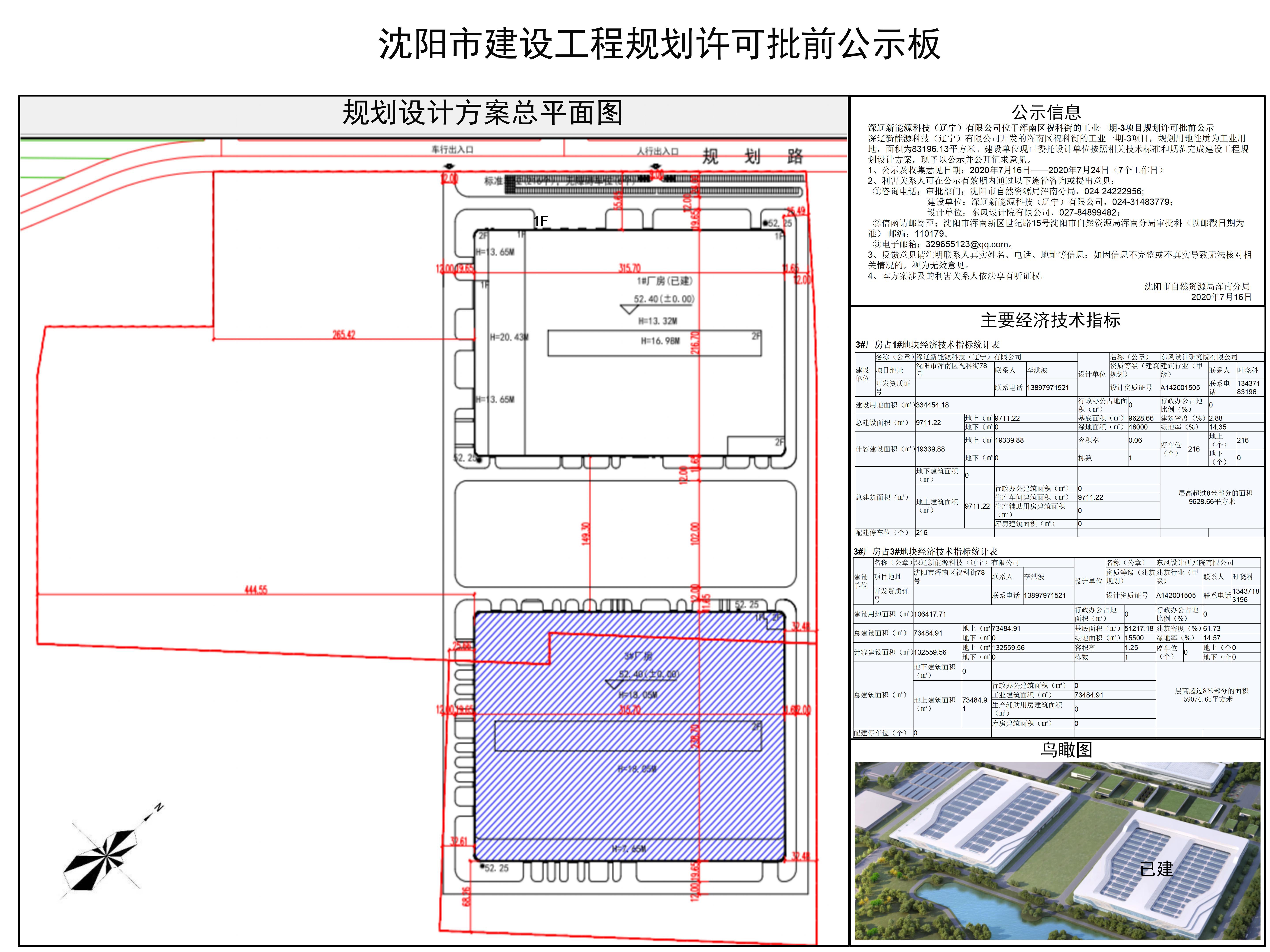 深辽新能源科技(辽宁)有限公司开发的浑南区祝科街的工业一期-3项目,规划用地性质为工业用地,面积为83196.13平方米。建设单位现已委托设计单位按照相关技术标准和规范完成建设工程规划设计方案,现予以公示并公开征求意见。 1、公示及收集意见日期:2020年7月16日——2020年7月24日(7个工作日) 2、利害关系人可在公示有效期内通过以下途径咨询或提出意见: ①咨询电话:审批部门:沈阳市自然资源局浑南分局,024-24222956; 建设单位:深辽新能源科技(辽宁)有限公司,024-31483779; 设计单位:东风设计院有限公司,027-84899482; ②信函请邮寄至;沈阳市浑南新区世纪路15号沈阳市自然资源局浑南分局审批科(以邮戳日期为准) 邮编:110179。 ③电子邮箱:329655123@qq.com。 3、反馈意见请注明联系人真实姓名、电话、地址等信息;如因信息不完整或不真实导致无法核对相关情况的,视为无效意见。 4、本方案涉及的利害关系人依法享有听证权。