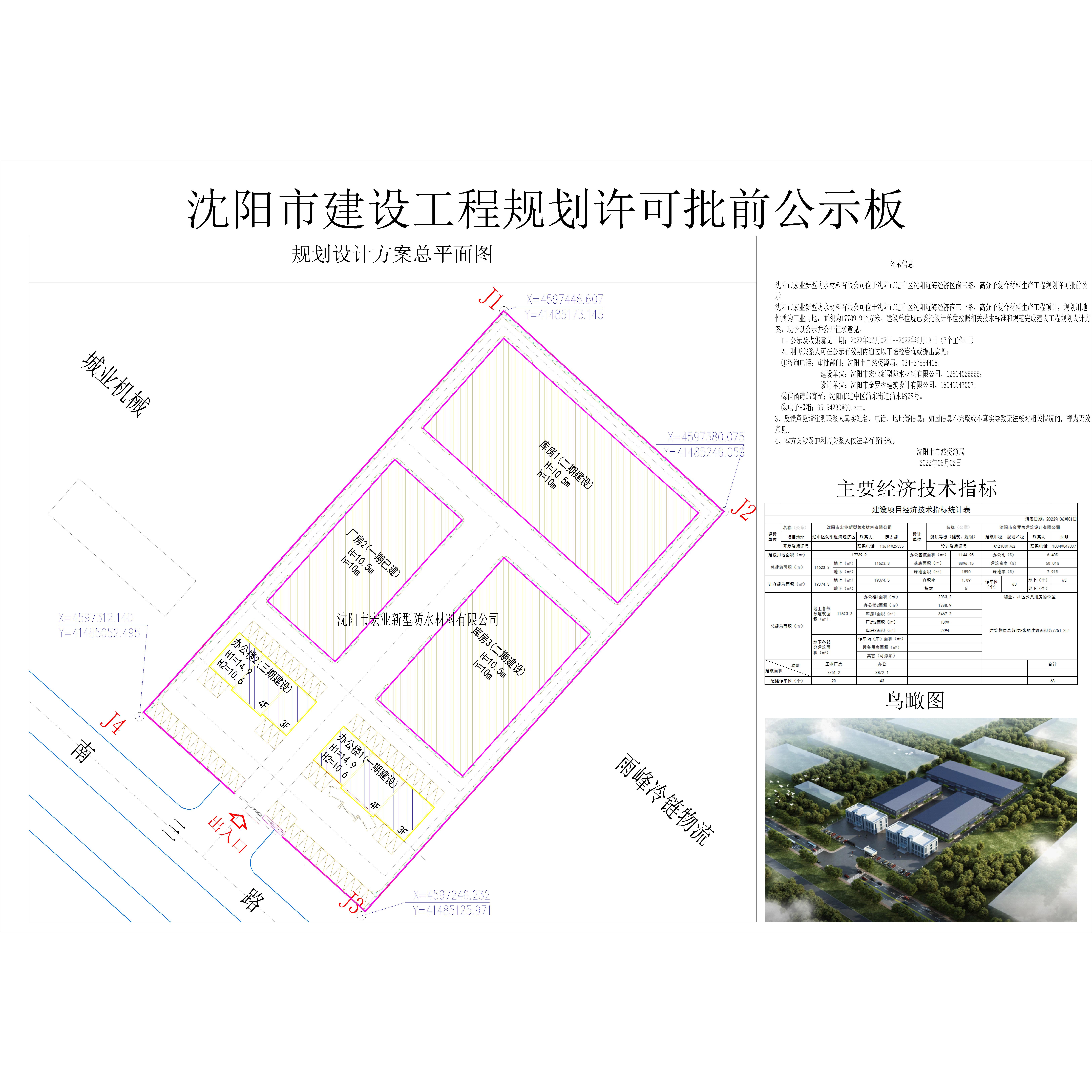 沈阳市宏业新型防水材料有限公司位于沈阳市辽中区沈阳近海经济南三一路,高分子复合材料生产工程项目,规划用地性质为工业用地,面积为17789.9平方米。建设单位现已委托设计单位按照相关技术标准和规范完成建设工程规划设计方案,现予以公示并公开征求意见。