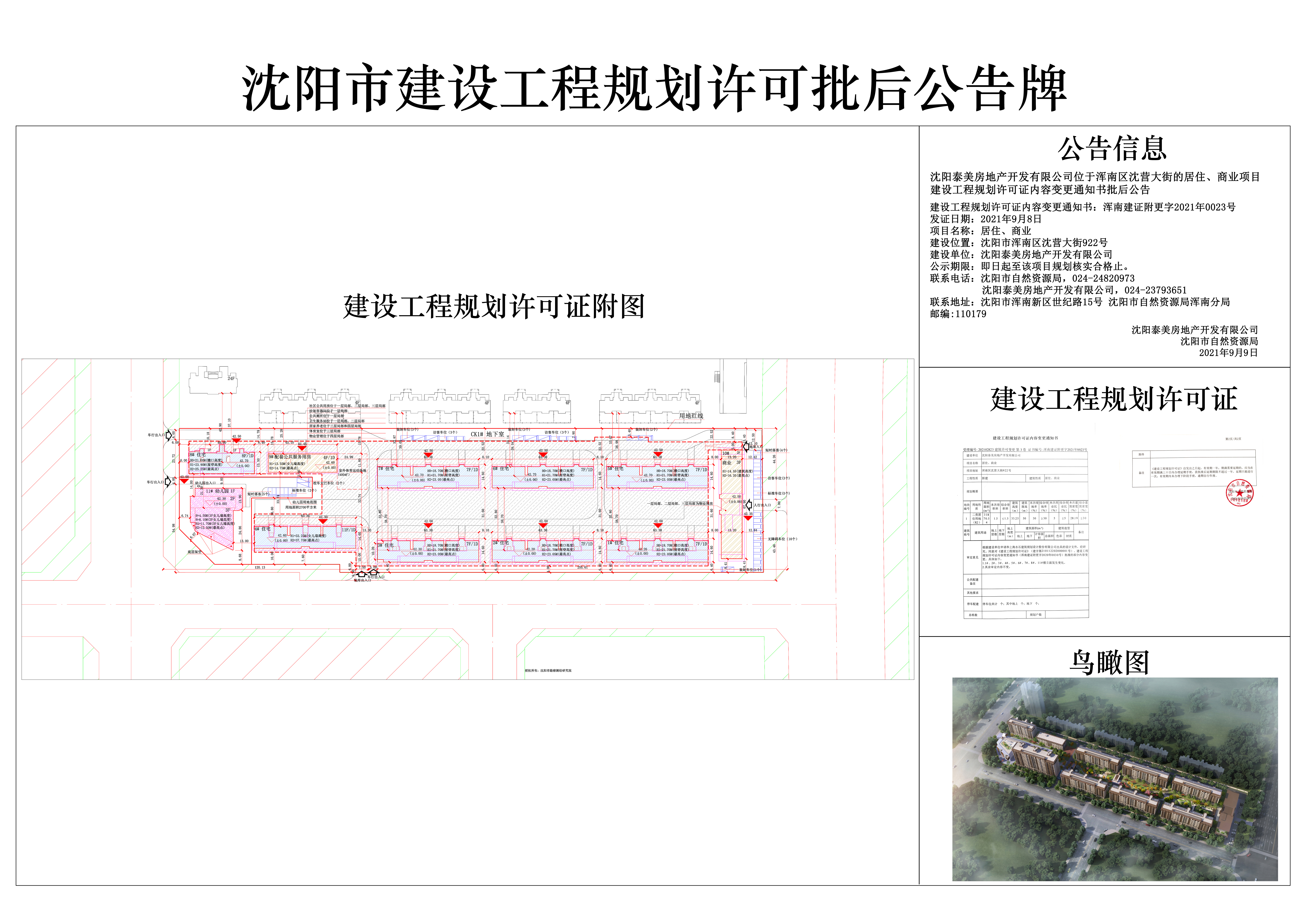 沈阳泰美房地产开发有限公司位于浑南区沈营大街的居住、商业项目建设工程规划许可证内容变更通知书批后公告