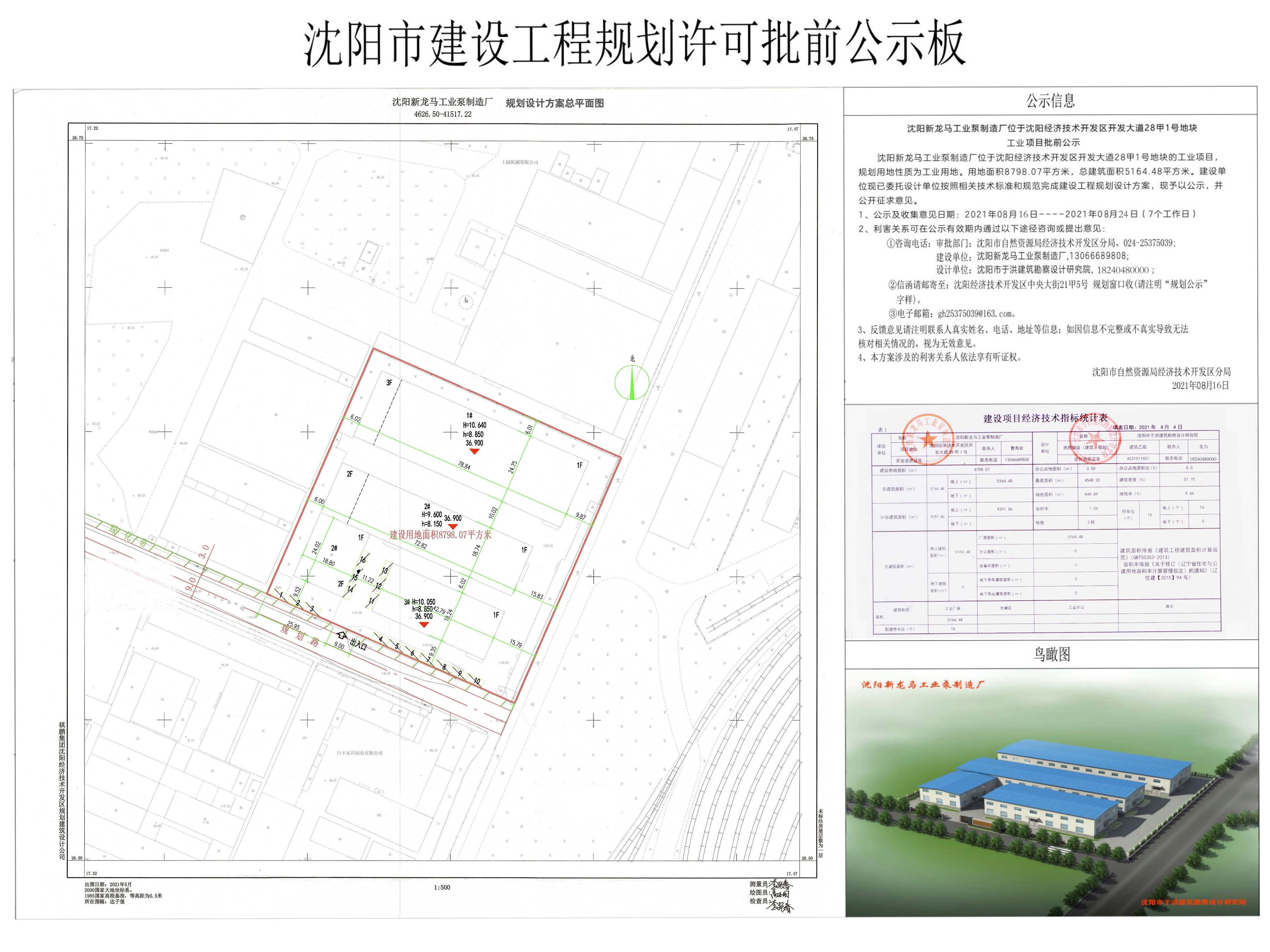 沈阳新龙马工业泵制造厂位于沈阳经济技术开发区开发大道28甲1号地块的工业项目,规划用地性质为工业用地,用地面积8798.07平方米,总建筑面积5164.48平方米。建设单位现已委托设计单位按照相关技术标准和规范完成建设工程规划设计方案,现予以公示,并公开征求意见。 1、公示及收集意见日期:2021年08月16日----2021年08月24日(7个工作日) 2、利害关系可在公示有效期内通过以下途径咨询或提出意见: ①咨询电话:审批部门:沈阳市自然资源局经济技术开发区分,024-25375039; 建设单位:沈阳新龙马工业泵制造厂,13066689808; 设计单位:沈阳市于洪建筑勘察设计研究院,18240480000; ②信函请邮寄至:沈阳经济技术开发区中央大街21甲5号 规划窗口收(请注明“规划公示”字样)。 ③电子邮箱:gh25375039@163.com。 3、反馈意见请注明联系人真实姓名、电话、地址等信息;如因信息不完整或不真实导致无法核对相关情况的,视为无效意见。 4、本方案涉及的利害关系人依法享有听证权。