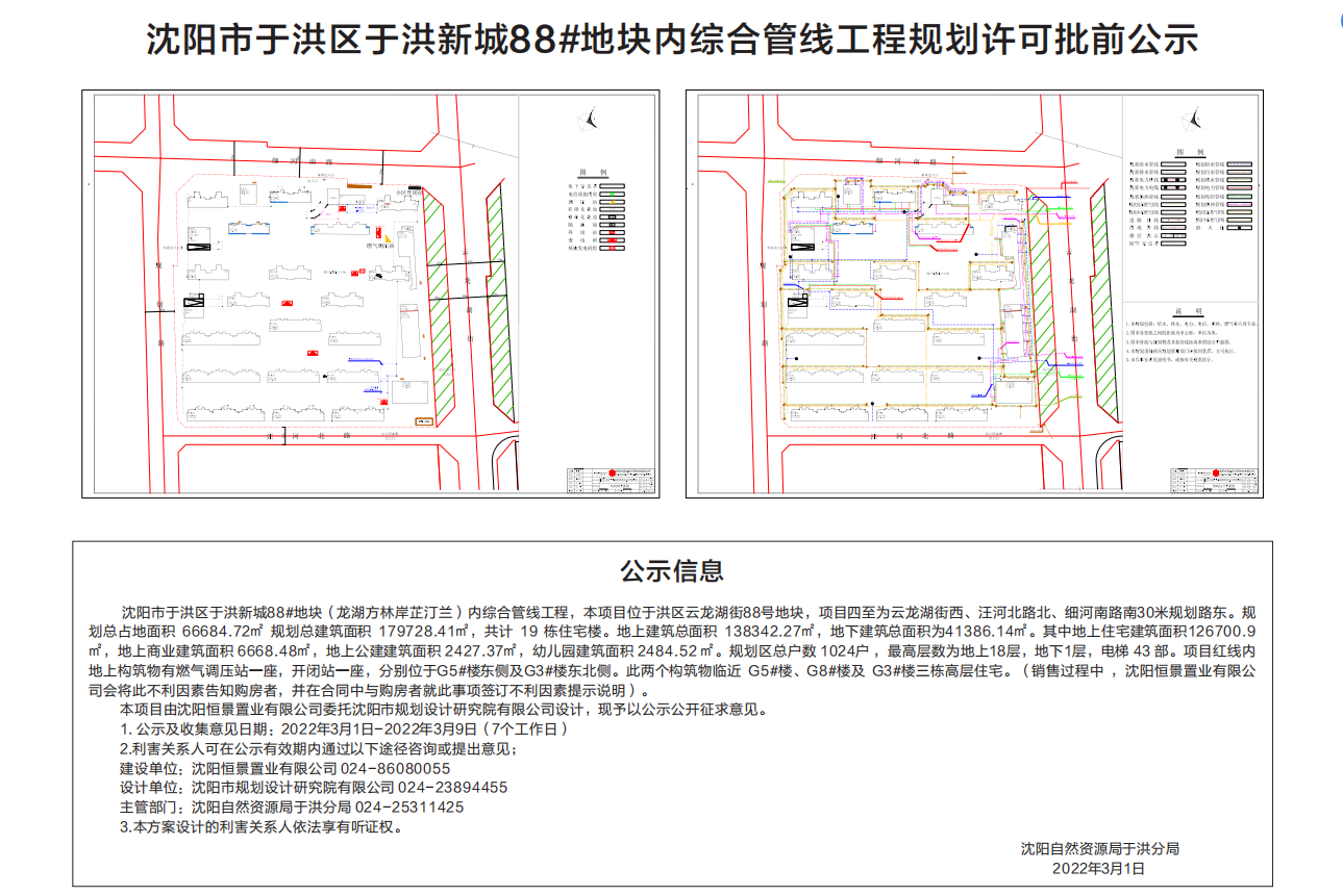 沈阳市于洪区于洪新城88#地块内综合管线工程规划许可批前公示沈阳市于洪区于洪新城88#地块(龙湖方林岸芷汀兰)内综合管线工程,本项目位于洪区云龙湖街88号地块,项目四至为云龙湖街西、汪河北路北、细河南路南30米规划路东。规划总占地面积 66684.72㎡ 规划总建筑面积 179728.41㎡,共计19栋住宅楼。地上建筑总面积 138342.27㎡,地下建筑总面积为41386.14㎡。其中地上住宅建筑面积126700.9㎡,地上商业建筑面积 6668.48㎡,地上公建建筑面积 2427.37㎡,幼儿园建筑面积 2484.52 ㎡。规划区总户数 1024户 ,最高层数为地上18层,地下1层,电梯43部。项目红线内地上构筑物有燃气调压站一座,开闭站一座,分别位于G5#楼东侧及G3#楼东北侧。此两个构筑物临近 G5#楼、G8#楼及 G3#楼三栋高层住宅。(销售过程中,沈阳恒景置业有限公司会将此不利因素告知购房者,并在合同中与购房者就此事项签订不利因素提示说明). 本项目由沈阳恒景置业有限公司委托沈阳市规划设计研究院有限公司设计,现予以公示公开征求意见. 1.公示及收集意见日期:2022年3月1日-2022年3月9日(7个工作日); 2.利害关系人可在公示有效期内通过以下途径咨询或提出意见; 建设单位:沈阳恒景置业有限公司 024-86080055 设计单位:沈阳市规划设计研究院有限公司 024-23894455 主管部门:沈阳自然资源局于洪分局 024-25311425 3.本方案设计的利害关系人依法享有听证权。