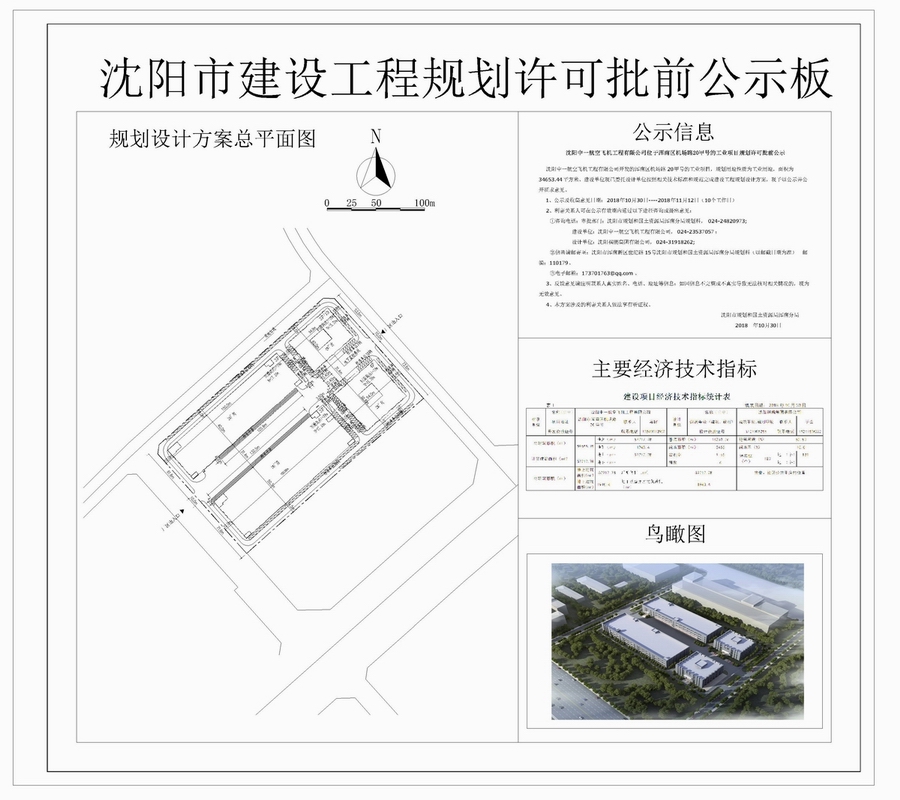 沈阳中一航空飞机工程有限公司开发的浑南区机场路20甲号的工业项目,规划用地性质为工业用地,面积为34653.44平方米。建设单位现已委托设计单位按照相关技术标准和规范完成建设工程规划设计方案,现予以公示并公开征求意见。 1、公示及收集意见日期:2018年10月31日——2018年11月13日(10个工作日) 2、利害关系人可在公示有效期内通过以下途径咨询或提出意见: ①咨询电话:审批部门:沈阳市规划和国土资源局浑南分局规划科,024-24820973; 建设单位:沈阳中一航空飞机工程有限公司,024-23537057; 设计单位:沈阳祺鹏集团有限公司,024-31918262; ②信函请邮寄至;沈阳市浑南新区世纪路15号沈阳市规划和国土资源局浑南分局规划科(以邮戳日期为准) 邮编:110179。 ③电子邮箱:173701763@qq.com。 3、反馈意见请注明联系人真实姓名、电话、地址等信息;如因信息不完整或不真实导致无法核对相关情况的,视为无效意见。