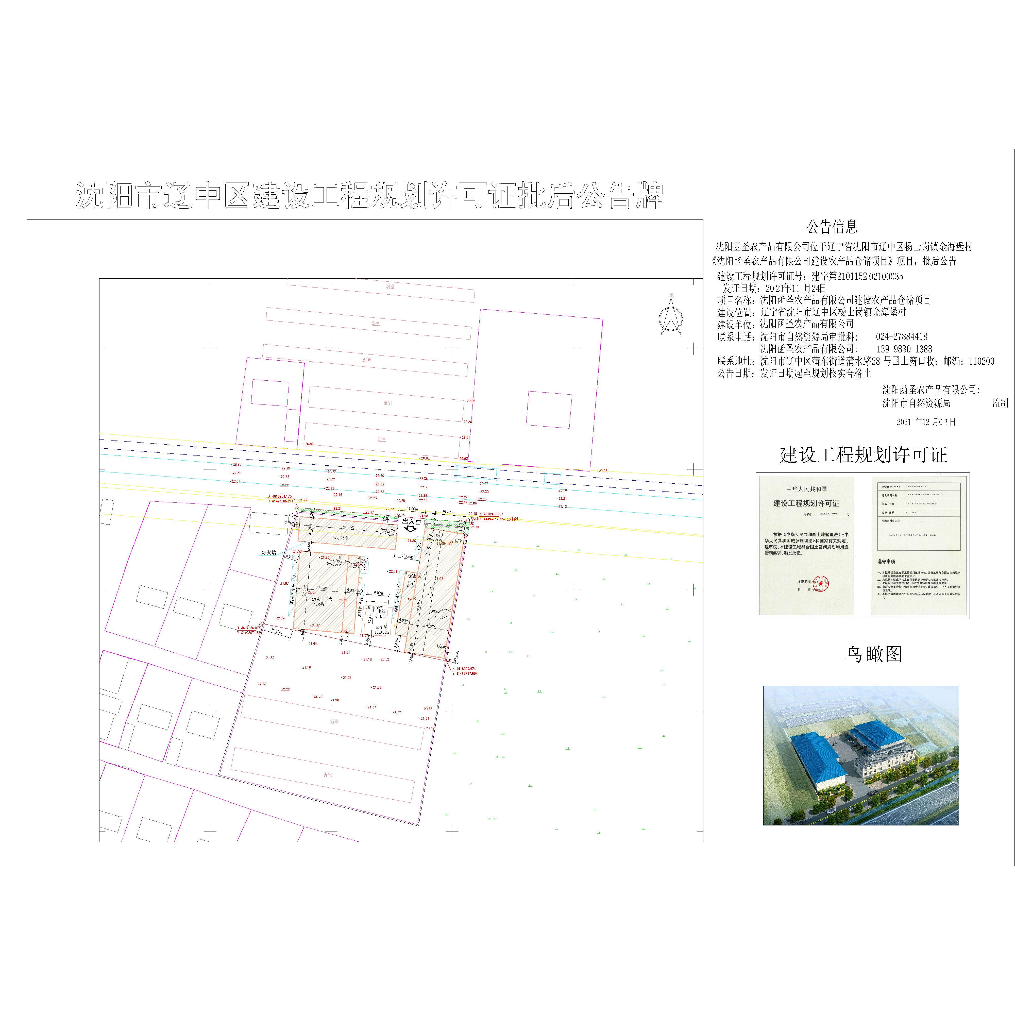 公告信息 《沈阳函圣农产品有限公司建设农产品仓储项目》项目,批后公告 沈阳函圣农产品有限公司位于辽宁省沈阳市辽中区杨士岗镇金海堡村 建设工程规划许可证号:建字第发证日期:沈阳函圣农产品有限公司建设农产品仓储项目 20 21年11月24日210115202100035 项目名称:建设位置:建设单位: 沈阳函圣农产品有限公司 辽宁省沈阳市辽中区杨士岗镇金海堡村 联系电话:沈阳市自然资源局审批科:沈阳函圣农产品有限公司: 024-27884418 139 9880 1388 公告日期:发证日期起至规划核实合格止联系地址:沈阳市辽中区蒲东街道蒲水路号国土窗口收;邮编:110200 沈阳函圣农产品有限公司: 沈阳市自然资源局监制 2021年12月03日