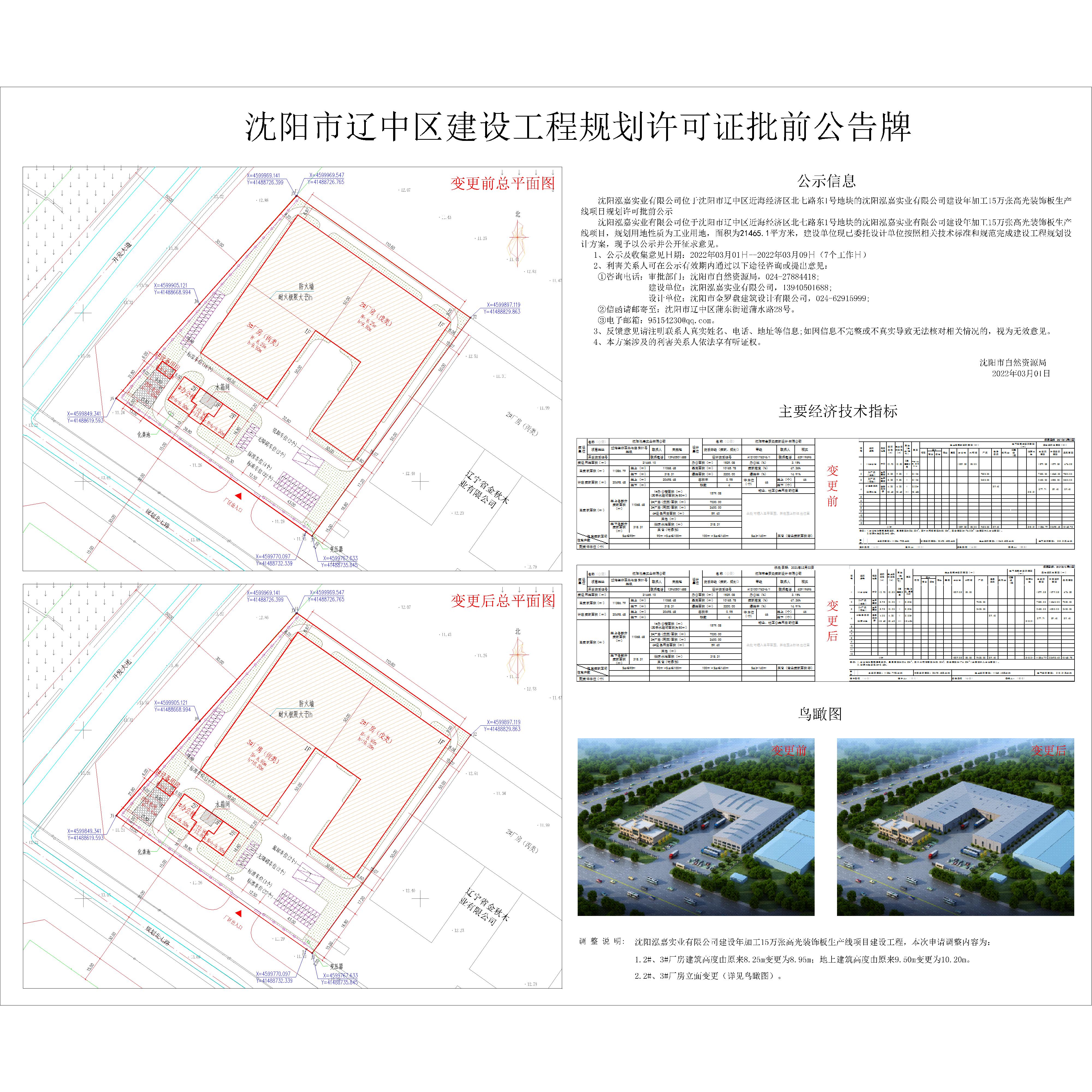 沈阳泓嘉实业有限公司位于沈阳市辽中区近海经济区北七路东1号地块的沈阳泓嘉实业有限公司建设年加工15万张高光装饰板生产线项目规划许可批前公示