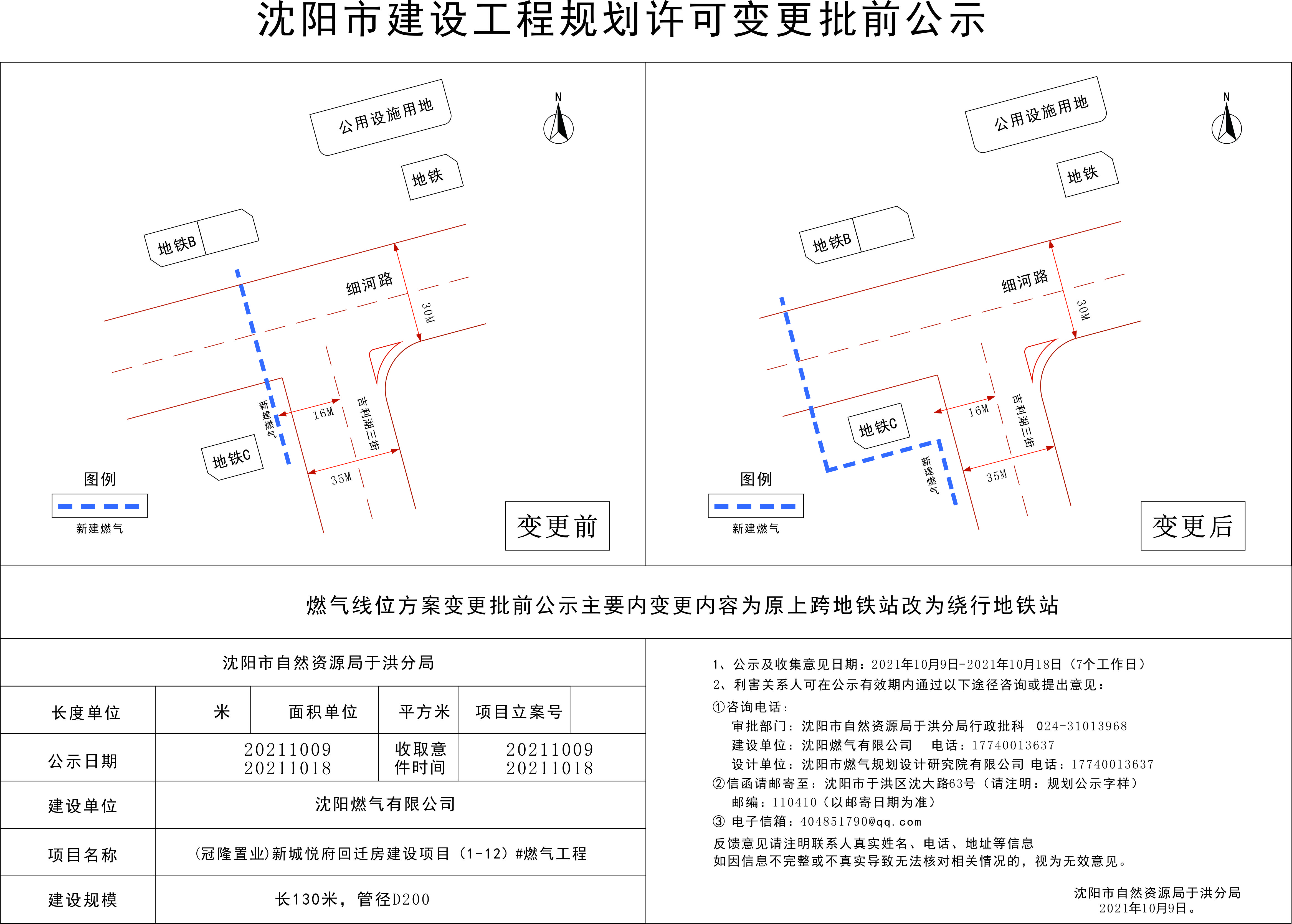 沈阳燃气有限公司“(冠隆置业)新城悦府回迁房建设项目(1-12)#燃气工程”《建设工程规划许可证》(市政)规划方案变更批前公示