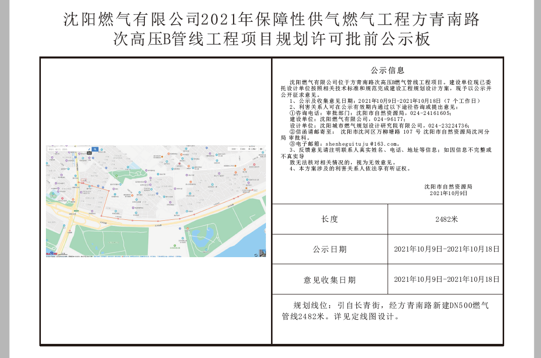 沈阳新北燃气有限公司位于方青南路的2021年保障性供气燃气工程方青南路次高压B燃气管线工程项目,建设单位现已委托设计单位按照相关技术标准和规范完成建设工程规划设计方案,现予以公示并公开征求意见。 1、公示及收集意见日期:2021年10月9日----2021年10月18日(7个工作日) 2、利害关系人可在公示有效期内通过以下途径咨询或提出意见: ①咨询电话:审批部门:沈阳市自然资源局,024-24161605; 建设单位:沈阳燃气有限公司,024-96177; 设计单位:沈阳城市燃气规划设计研究院有限公司,024-23224736; ②信函请邮寄至:沈阳市沈河区万柳塘路107号 沈阳市自然资源局沈河分局 审批科。 ③电子邮箱:shenheguituju @163.com。 3、反馈意见请注明联系人真实姓名、电话、地址等信息;如因信息不完整或不真实导致无法核对相关情况的,视为无效意见。 4、本方案涉及的利害关系人依法享有听证权。 沈阳市自然资源局 2021年10月9日