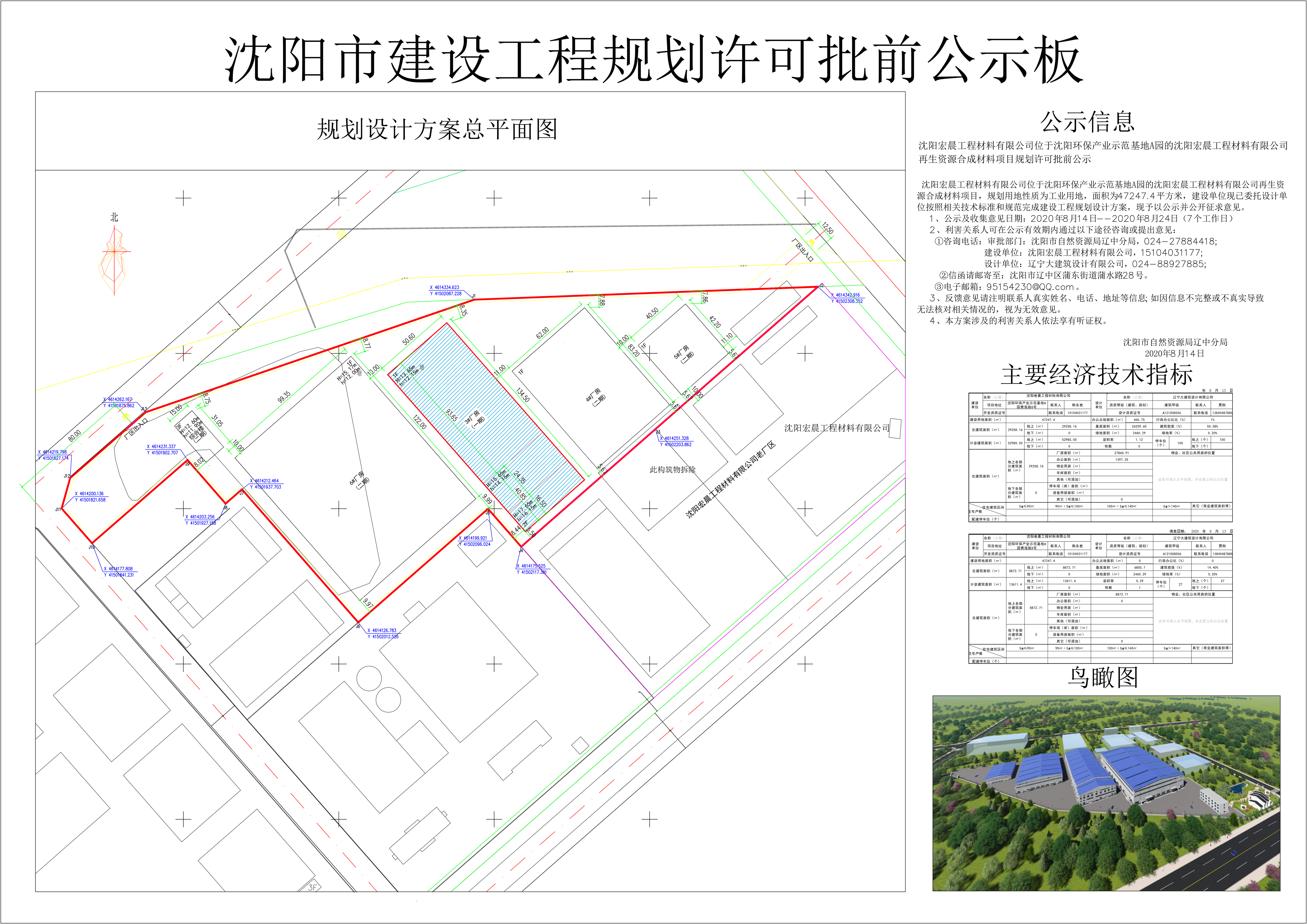 沈阳宏晨工程材料有限公司位于沈阳市辽中区沈阳宏晨工程材料有限公司再生资源合成材料项目,规划用地性质为工业用地,面积为47247.4平方米,建设单位现已委托设计单位按照相关技术标准和规范完成建设工程规划设计方案,现予以公示并公开征求意见。 1、公示及收集意见日期:2020年08月14日--2020年08月24日(7个工作日) 2、利害关系人可在公示有效期内通过以下途径咨询或提出意见: ①咨询电话:审批部门:沈阳市自然资源局辽中分局,024-27884418; 建设单位: 沈阳宏晨工程材料有限公司,15104031177; 设计单位:辽宁大建筑设计有限公司,024-88927885; ②信函请邮寄至:沈阳市辽中区蒲东街道蒲水路28号 ③电子邮箱:95154230@QQ.com。 3、反馈意见请注明联系人真实姓名、电话、地址等信息;如因信息不完整或不真实导致 无法核对相关情况的,视为无效意见。 4、本方案涉及的利害关系人依法享有听证权。