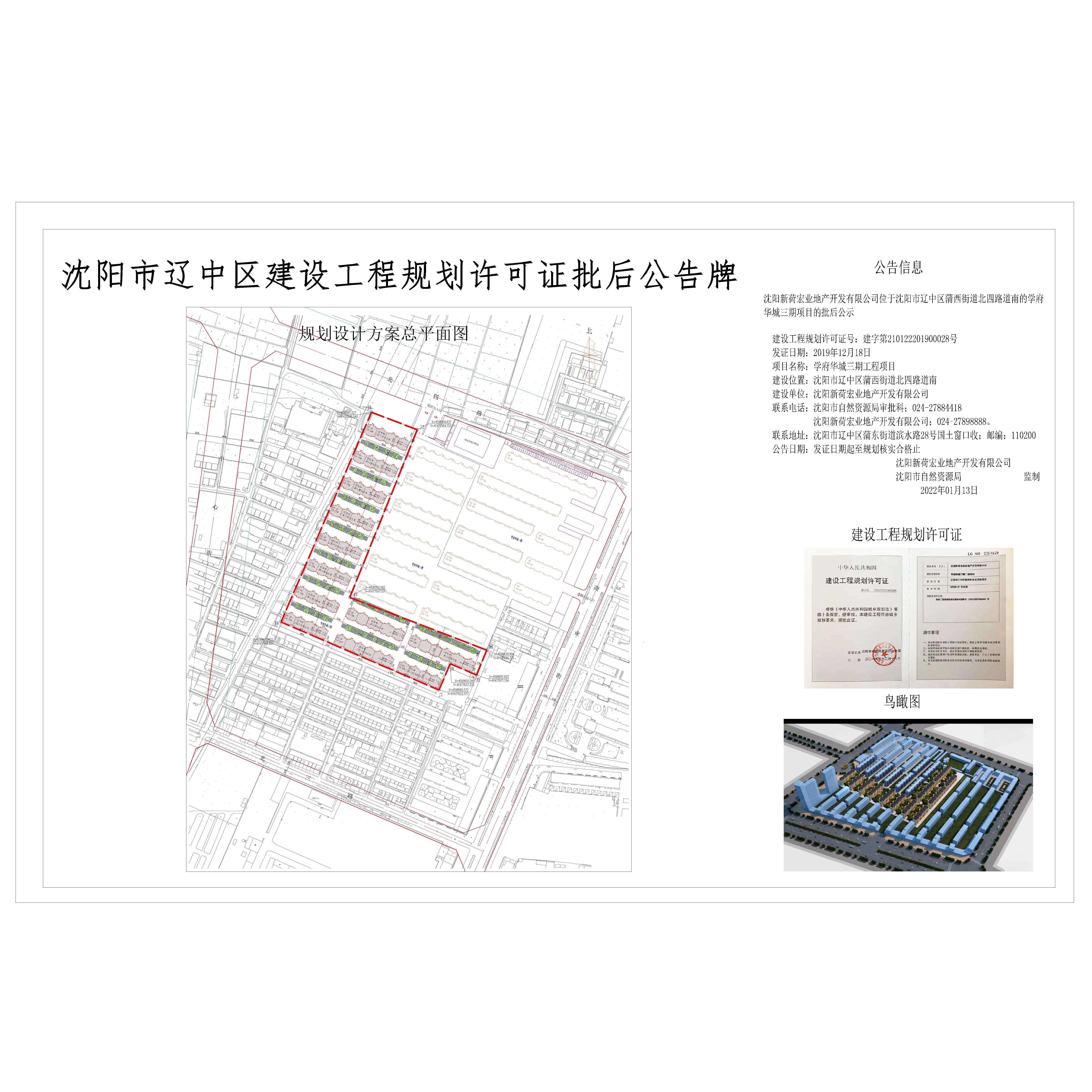 公告信息 沈阳新荷宏业地产开发有限公司位于沈阳市辽中区蒲西街道北四路道南的学府华城三期项目的批后公示 建设工程规划许可证号:建字第210122201900028号 发证日期:2019年12月18日 项目名称:学府华城三期工程项目 建设位置:沈阳市辽中区蒲西街道北四路道南 建设单位:沈阳新荷宏业地产开发有限公司 联系电话:沈阳市自然资源局审批科;024-27884418 沈阳新荷宏业地产开发有限公司;024-27898888。 联系地址:沈阳市辽中区蒲东街道滨水路28号国土窗口收;邮编:110200 公告日期:发证日期起至规划核实合格止 沈阳新荷宏业地产开发有限公司 沈阳市自然资源局 监制 2022年01月13日