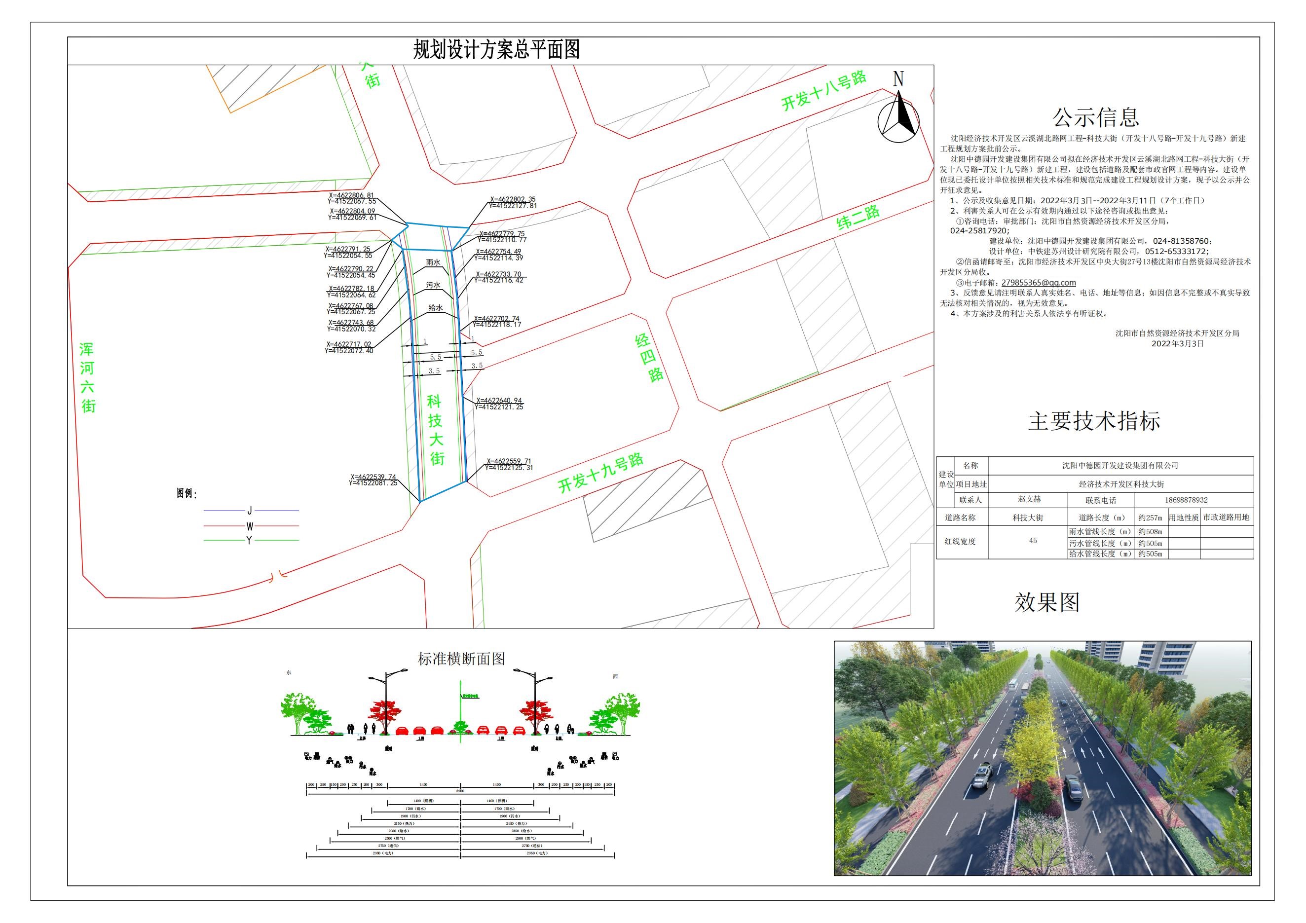 公示信息 沈阳中德园开发建设集团有限公司拟在经济技术开发区新建云溪湖北路网工程-科技大街(开发十八号路-开发十九号路)新建工程,建设包括道路及配套市政管线工程等内容。建设单位现已委托设计单位按照相关技术标准和规范完成建设工程规划设计方案,现予以公示并公开征求意见。 1、公示及收集意见日期:2022年3月3日--2022年3月11日(7个工作日) 2、利害关系人可在公示有效期内通过以下途径咨询或提出意见: ①咨询电话:审批部门:沈阳市自然资源经济技术开发区分局,024-25817920; 建设单位:沈阳中德园开发建设集团有限公司,024-81358760; 设计单位:中铁建苏州设计研究院有限公司,0512-65333172; ②信函请邮寄至;沈阳市经济技术开发区中央大街27号13楼沈阳市自然资源局经济技术开发区分局收。 ③电子邮箱:279855365@qq.com。 3、反馈意见请注明联系人真实姓名、电话、地址等信息;如因信息不完整或不真实导致无法核对相关情况的,视为无效意见。 4、本方案涉及的利害关系人依法享有听证权。