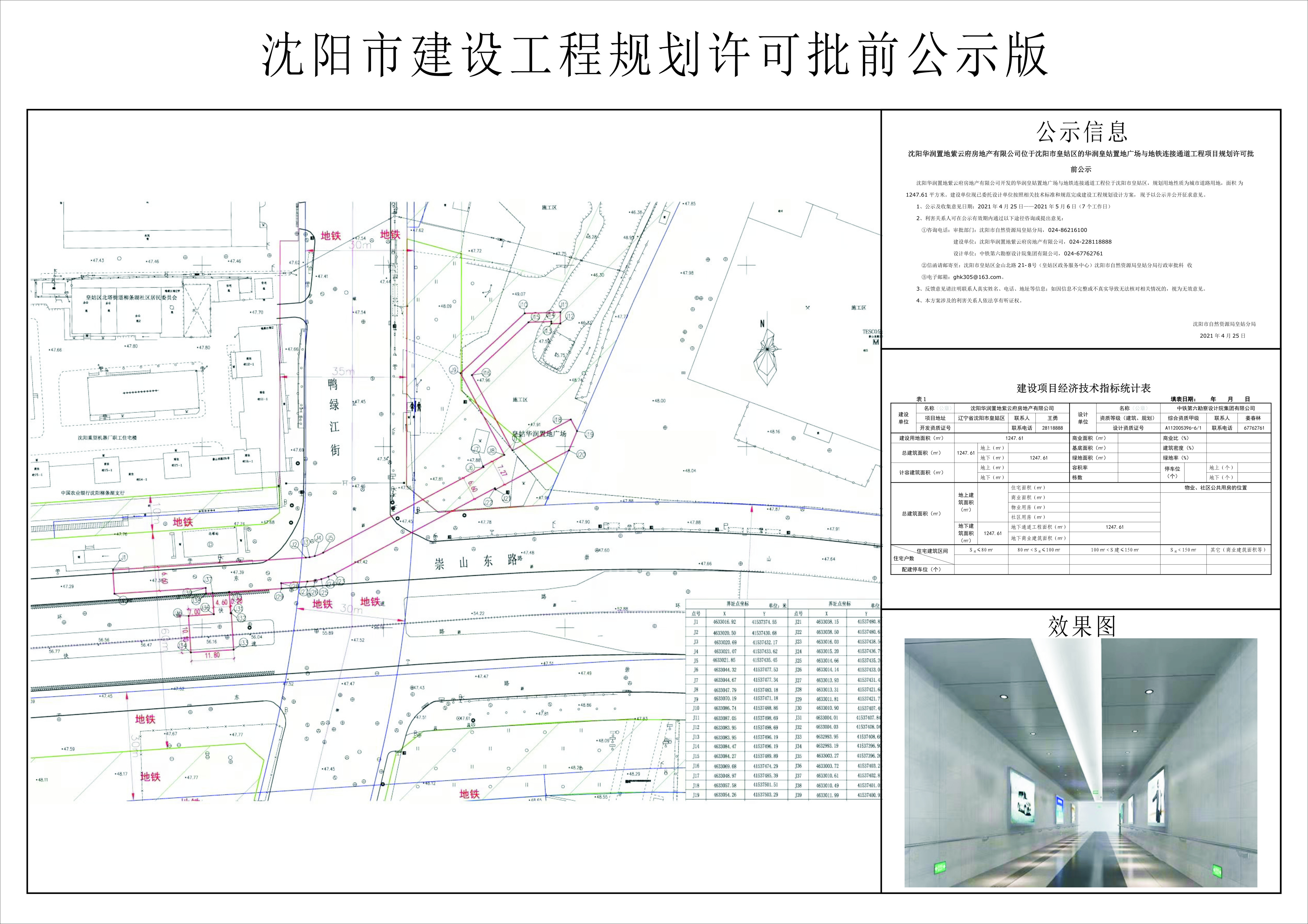 沈阳华润置地紫云府房地产有限公司位于沈阳市皇姑区的华润皇姑置地广场与地铁连接通道工程项目规划许可批前公示