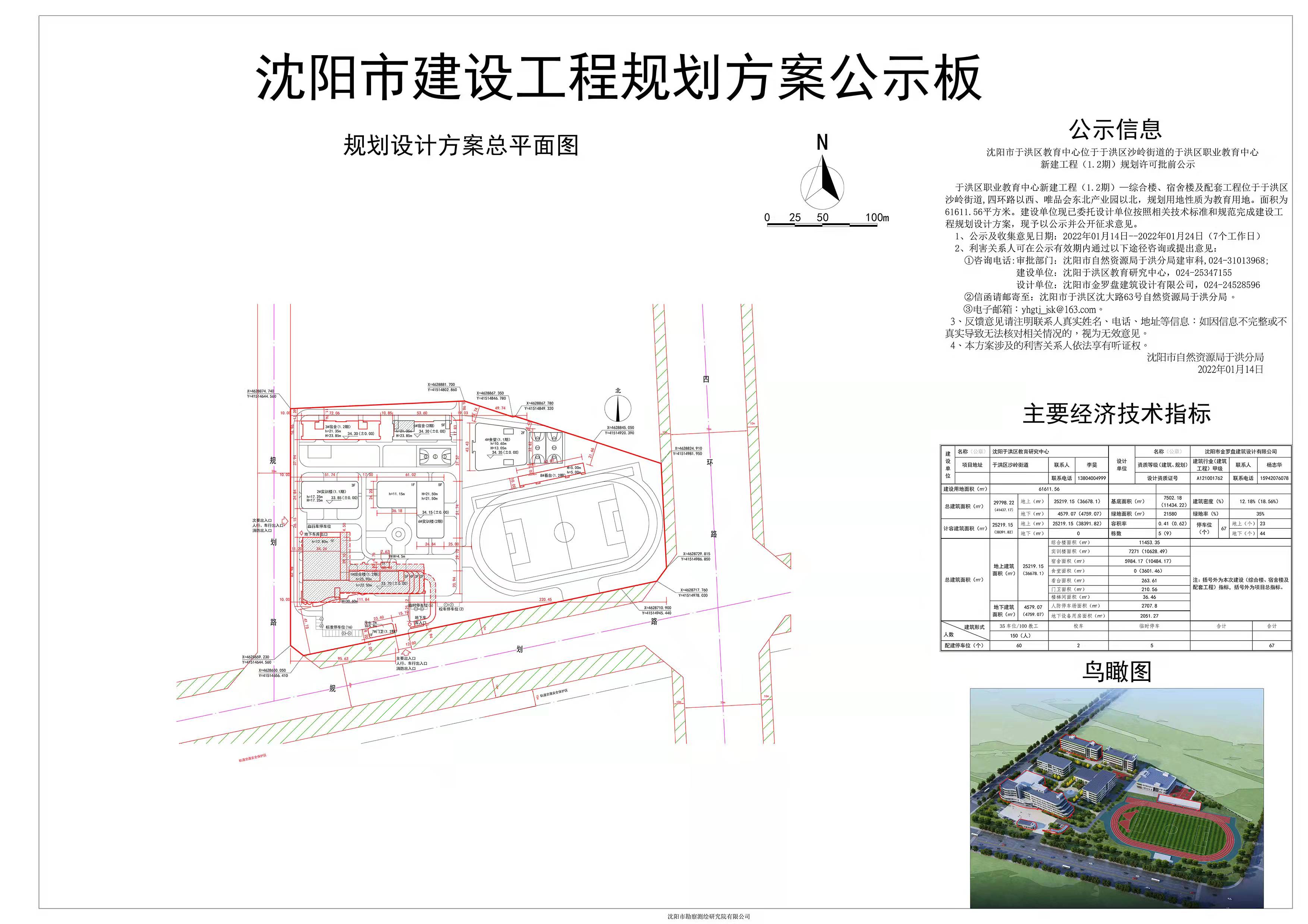 于洪区职业教育中心新建工程(1.2期)—综合楼、宿舍楼及配套工程位于于洪区沙岭街道,四环路以西、唯品会东北产业园以北, 规划用地性质为教育用地。面积为61611.56平方米。建设单位现已委托设计单位按照相关技术标准和规范完成建设工程规划设计方案, 现予以公示并公开征求意见。 1、公示及收集意见日期:2022年01月14日--2022年01月24日(7个工作日) 2、利害关系人可在公示有效期内通过以下途径咨询或提出意见: ①咨询电话:审批部门:沈阳市自然资源局于洪分局建审科,024-31013968; 建设单位:沈阳于洪区教育研究中心,024-25347155 设计单位:沈阳市金罗盘建筑设计有限公司,024-24528596 ②信函请邮寄至:沈阳市于洪区沈大路63号自然资源局于洪分局_。 ③电子邮箱:yhgtj_jsk@163.com。 3、反馈意见请注明联系人真实姓名、电话、地址等信息:如因信息不完整或不真 实导致无法核对相关情况的,视为无效意见。 4、本方案涉及的利害关系人依法享有听证权。 沈阳市自然资源局于洪分局 2022年01月14日