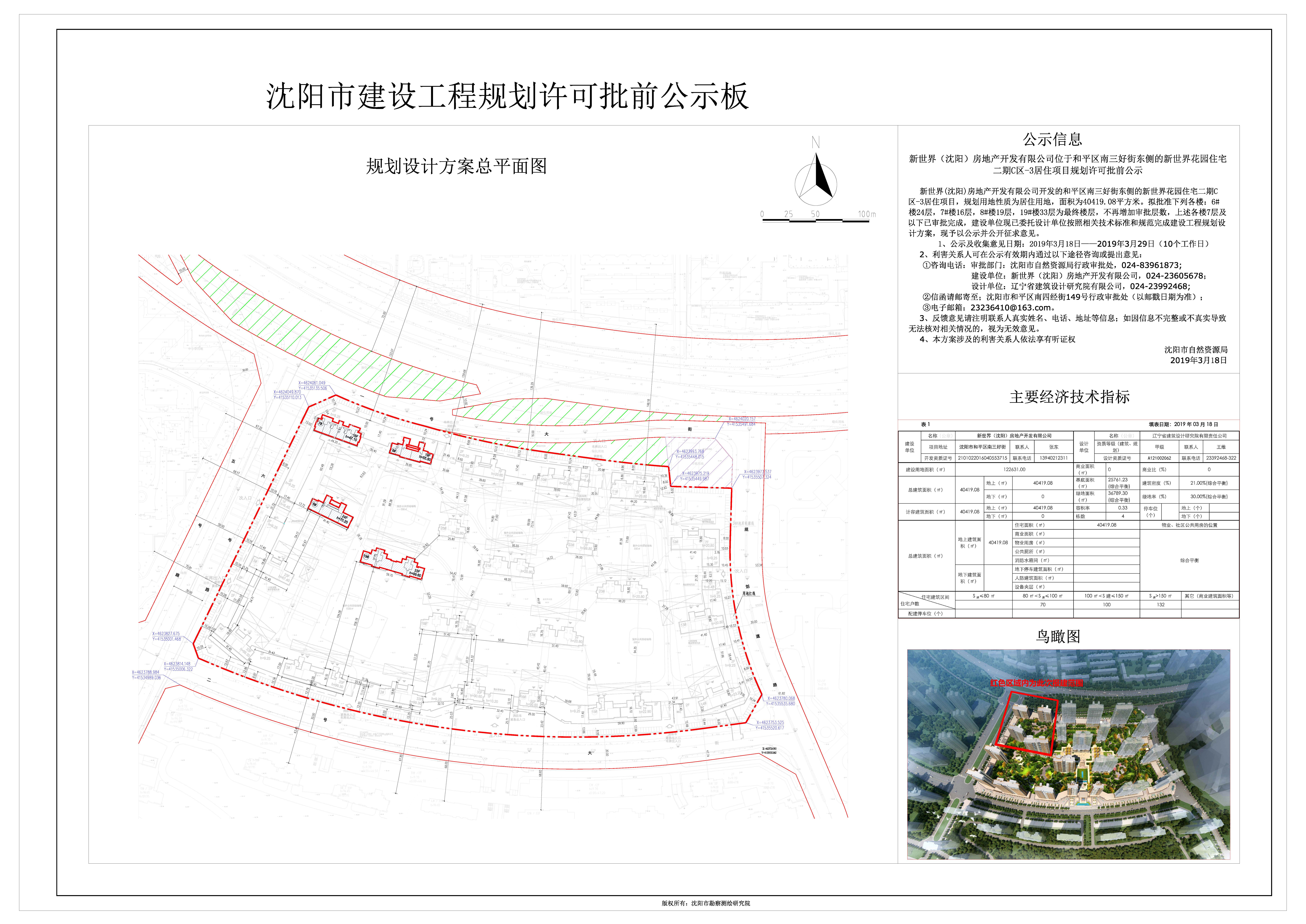 新世界(沈阳)房地产开发有限公司开发的和平区南三好街东侧的新世界花园住宅二期C区-3居住项目,规划用地性质为居住用地,面积为40419.08平方米。拟批准下列各楼:6#楼24层,7#楼16层,8#楼19层,19#楼33层为最终楼层,不再增加审批层数,上述各楼7层及以下已审批完成,建设单位现已委托设计单位按照相关技术标准和规范完成建设工程规划设计方案,现予以公示并公开征求意见。 1、公示及收集意见日期:2019年3月18日——2019年3月29日(10个工作日) 2、利害关系人可在公示有效期内通过以下途径咨询或提出意见: ①咨询电话:审批部门:沈阳市自然资源局行政审批处,024-83961873; 建设单位:新世界(沈阳)房地产开发有限公司,024-23605678; 设计单位:辽宁省建筑设计研究院有限公司,024-23992468; ②信函请邮寄至;沈阳市和平区南四经街149号行政审批处(以邮戳日期为准); ③电子邮箱:23236410@163.com。 3、反馈意见请注明联系人真实姓名、电话、地址等信息;如因信息不完整或不真实导致无法核对相关情况的,视为无效意见。 4、本方案涉及的利害关系人依法享有听证权。