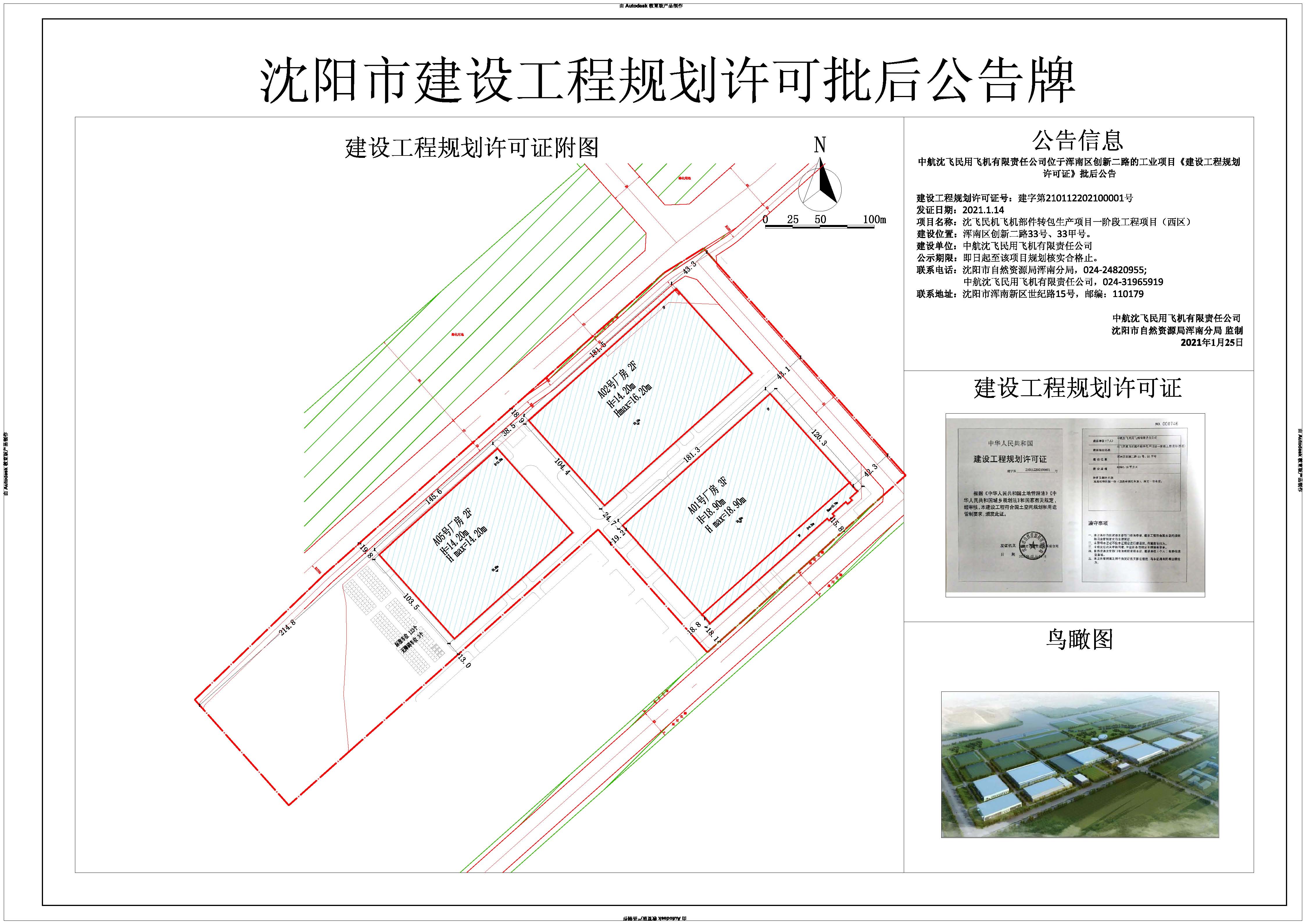 建设工程规划许可证号:建字第210112202100001号 发证日期:2021.1.14 项目名称:沈飞民机飞机部件转包生产项目一阶段工程项目(西区) 建设位置:浑南区创新二路33号、33甲号。 建设单位:中航沈飞民用飞机有限责任公司 公示期限:即日起至该项目规划核实合格止。 联系电话:沈阳市自然资源局浑南分局,024-24820955; 中航沈飞民用飞机有限责任公司,024-31965919 联系地址:沈阳市浑南新区世纪路15号,邮编:110179