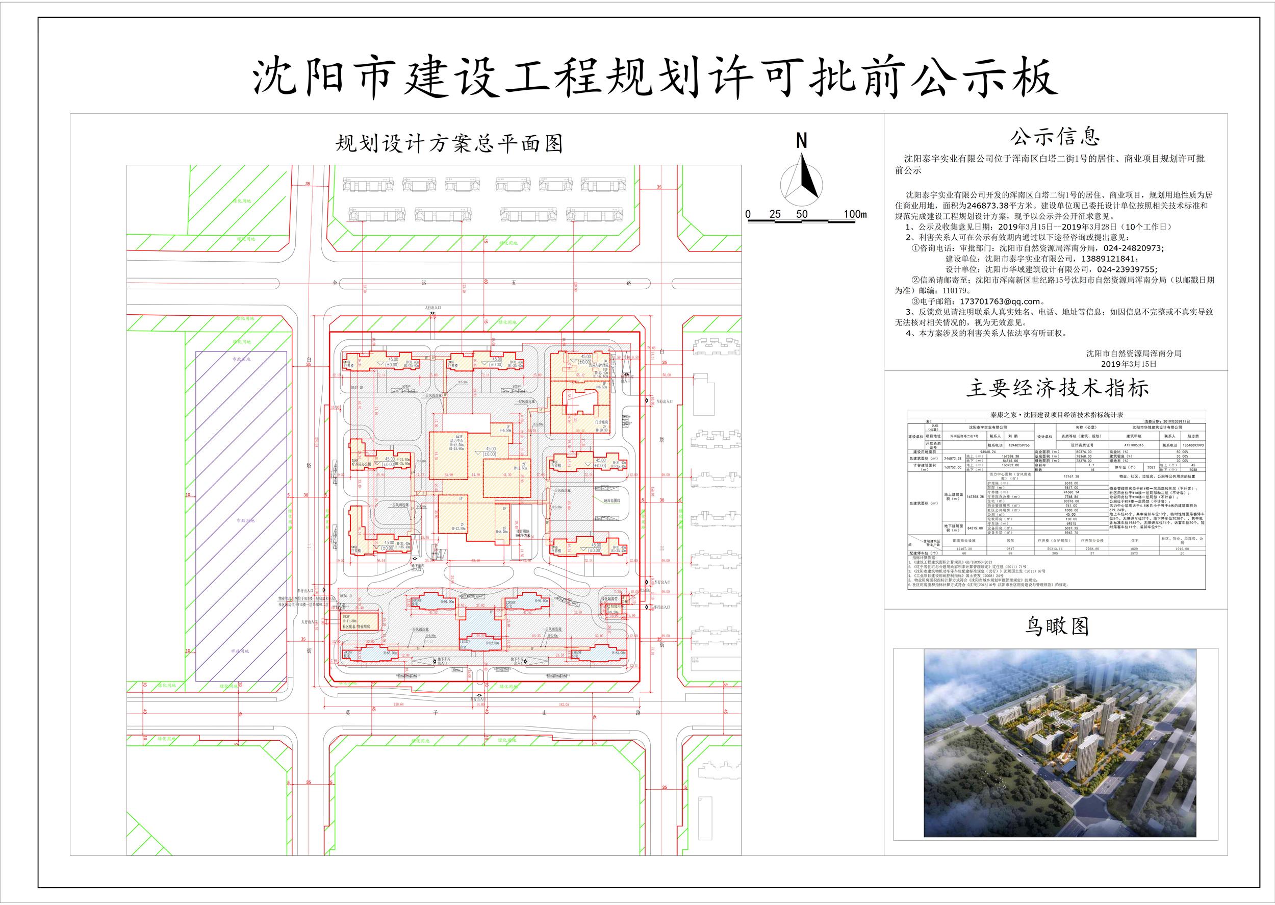 沈阳泰宇实业有限公司开发的浑南区白塔二街1号的居住、商业项目,规划用地性质为居住商业用地,面积为246873.38平方米。建设单位现已委托设计单位按照相关技术标准和规范完成建设工程规划设计方案,现予以公示并公开征求意见。 1、公示及收集意见日期:2019年3月15日——2019年3月28日(10个工作日) 2、利害关系人可在公示有效期内通过以下途径咨询或提出意见: ①咨询电话:审批部门:沈阳市自然资源局浑南分局,024-24820973; 建设单位:沈阳市泰宇实业有限公司,13889121841; 设计单位:沈阳市华域建筑设计有限公司,024-23939755; ②信函请邮寄至;沈阳市浑南新区世纪路15号沈阳市自然资源局浑南分局(以邮戳日期为准) 邮编:110179。 ③电子邮箱:173701763@qq.com。 3、反馈意见请注明联系人真实姓名、电话、地址等信息;如因信息不完整或不真实导致无法核对相关情况的,视为无效意见。 4、本方案涉及的利害关系人依法享有听证权。
