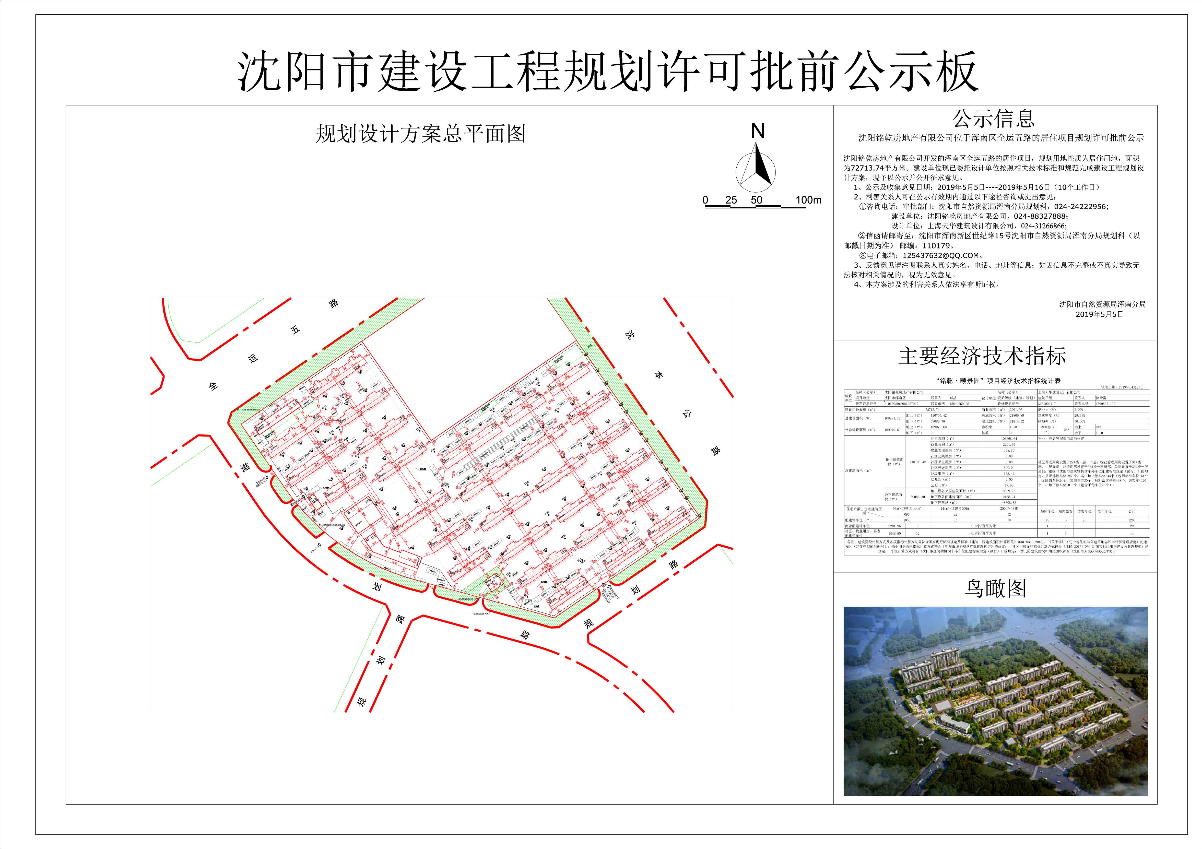 沈阳铭乾房地产有限公司开发的浑南区全运五路的居住项目,规划用地性质为居住用地,面积为72713.74平方米。建设单位现已委托设计单位按照相关技术标准和规范完成建设工程规划设计方案,现予以公示并公开征求意见。 1、公示及收集意见日期:2019年5月5日——2019年5月16日(10个工作日) 2、利害关系人可在公示有效期内通过以下途径咨询或提出意见: ①咨询电话:审批部门:沈阳市自然资源局浑南分局规划科,024-24222956; 建设单位:沈阳铭乾房地产有限公司,024-88327888; 设计单位:上海天华建筑设计有限公司,024-31266866; ②信函请邮寄至;沈阳市浑南新区世纪路15号沈阳市自然资源局浑南分局规划科(以邮戳日期为准) 邮编:110179。 ③电子邮箱:125437632@qq.com。 3、反馈意见请注明联系人真实姓名、电话、地址等信息;如因信息不完整或不真实导致无法核对相关情况的,视为无效意见。 4、本方案涉及的利害关系人依法享有听证权。