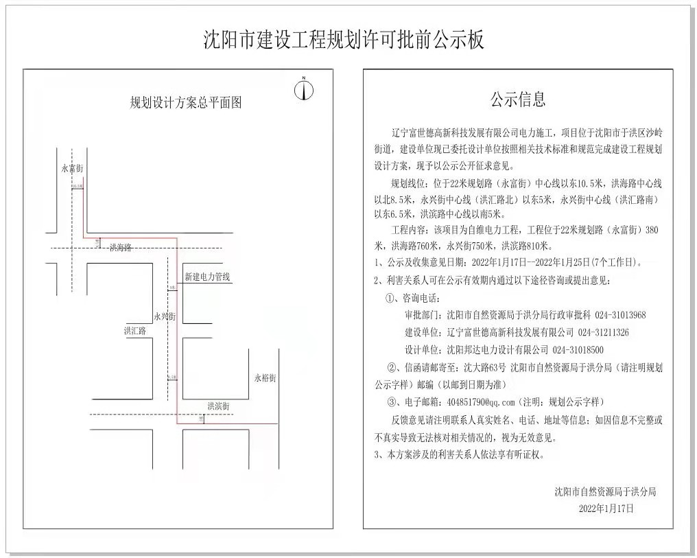 辽宁富世德高新科技发展有限公司电力施工规划方案批前公示 辽宁富世德高新科技发展有限公司电力施工,项目位于沈阳市于洪区沙岭街道,建设单位现已委托设计单位按照相 关技术标准和规范完成建设工程规划设计方案,现予以公示公开征求意见。 规划线位:位于22米规划路(永富街)中心线以东10.5米,洪海路中心线以北8.5米, 永兴街中心线(洪汇路北)以东5米,永兴街中心线(洪汇路南)以东6.5米,洪滨路中心线以南5米。 工程内容:该项目为自维工程,工程位于22米规划路(永富街)380米,洪海路760米,永兴街750米,洪滨路810米。 1、 公示及收集意见日期:2022年1月17日--2022年1月25日(7个工作日)。 2、 利害关系人可在公示有效期内通过以下途径咨询或提出意见: ① 、咨询电话: 审批部门:沈阳市自然资源局于洪分局行政审批科 024-31013968 建设单位:辽宁富世德高新科技发展有限公司 024-31211326 设计单位:沈阳邦达电力设计有限公司 024-31018500 ② 、信函请邮寄至:沈大路63号 沈阳市自然资源局于洪分局(请注明规划公示字样) ③ 、电子邮箱:404851790@qq.com(注明:规划公示字样) 反馈意见请注明联系人真实姓名、电话、地址等信息;如因信息不完整或不真实导致无法核对相关情况的,视为无效意见。 3、 本方案涉及的利害关系人依法享有听证权。