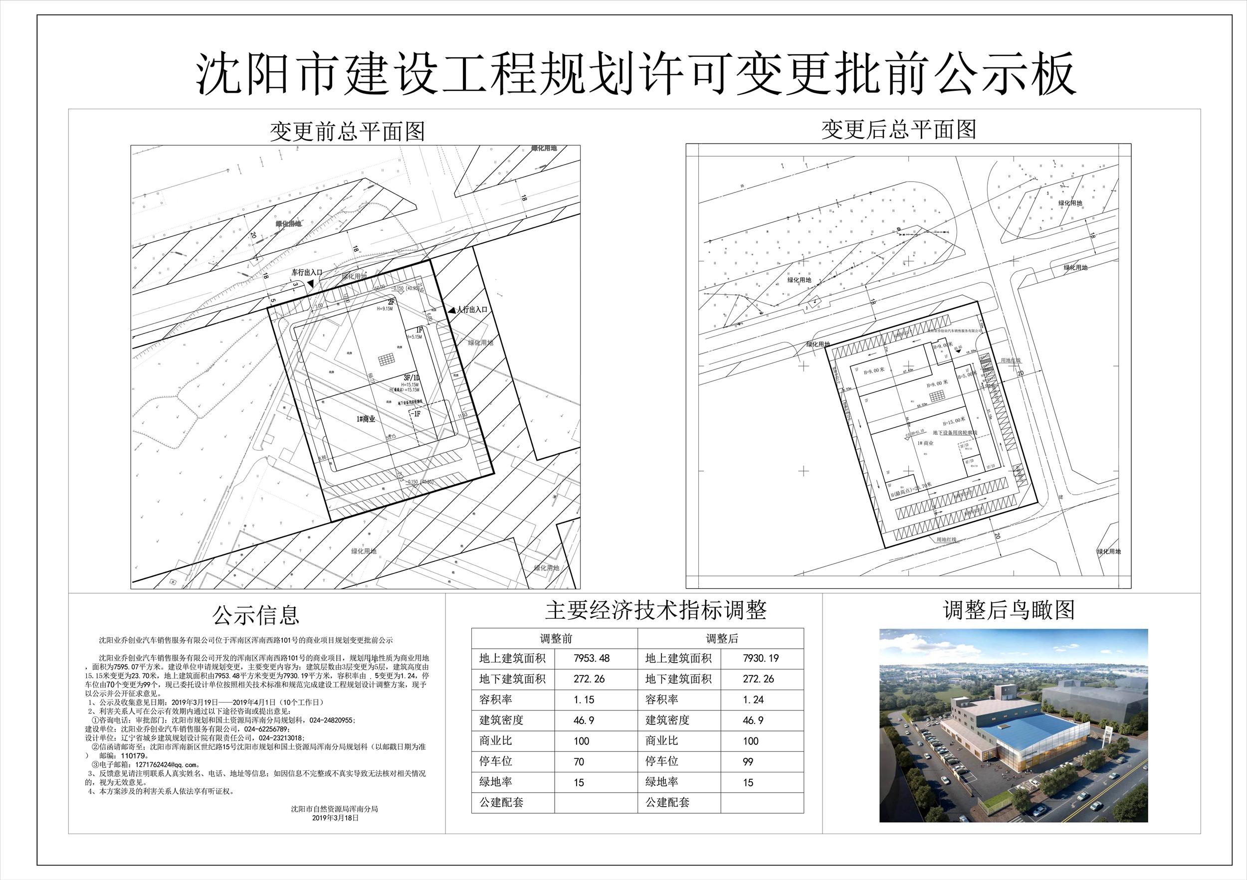 沈阳业乔创业汽车销售服务有限公司开发的浑南区浑南西路101号的商业项目,规划用地性质为商业用地,面积为7595.07平方米。建设单位申请规划变更,主要变更内容为:建筑层数由3层变更为5层,建筑高度由15.15米变更为23.70米,地上建筑面积由7953.48平方米变更为7930.19平方米,容积率由1.15变更为1.24,停车位由70个变更为99个,现已委托设计单位按照相关技术标准和规范完成建设工程规划设计调整方案,现予以公示并公开征求意见。 1、公示及收集意见日期:2019年3月19日——2019年4月1日(10个工作日) 2、利害关系人可在公示有效期内通过以下途径咨询或提出意见: ①咨询电话:审批部门:沈阳市规划和国土资源局浑南分局规划科,024-24820955; 建设单位:沈阳业乔创业汽车销售服务有限公司,024-62256789; 设计单位:辽宁省城乡建筑规划设计院有限责任公司,024-23213018; ②信函请邮寄至;沈阳市浑南新区世纪路15号沈阳市规划和国土资源局浑南分局规划科(以邮戳日期为准) 邮编:110179。 ③电子邮箱:1271762424@qq.com。 3、反馈意见请注明联系人真实姓名、电话、地址等信息;如因信息不完整或不真实导致无法核对相关情况的,视为无效意见。 4、本方案涉及的利害关系人依法享有听证权。
