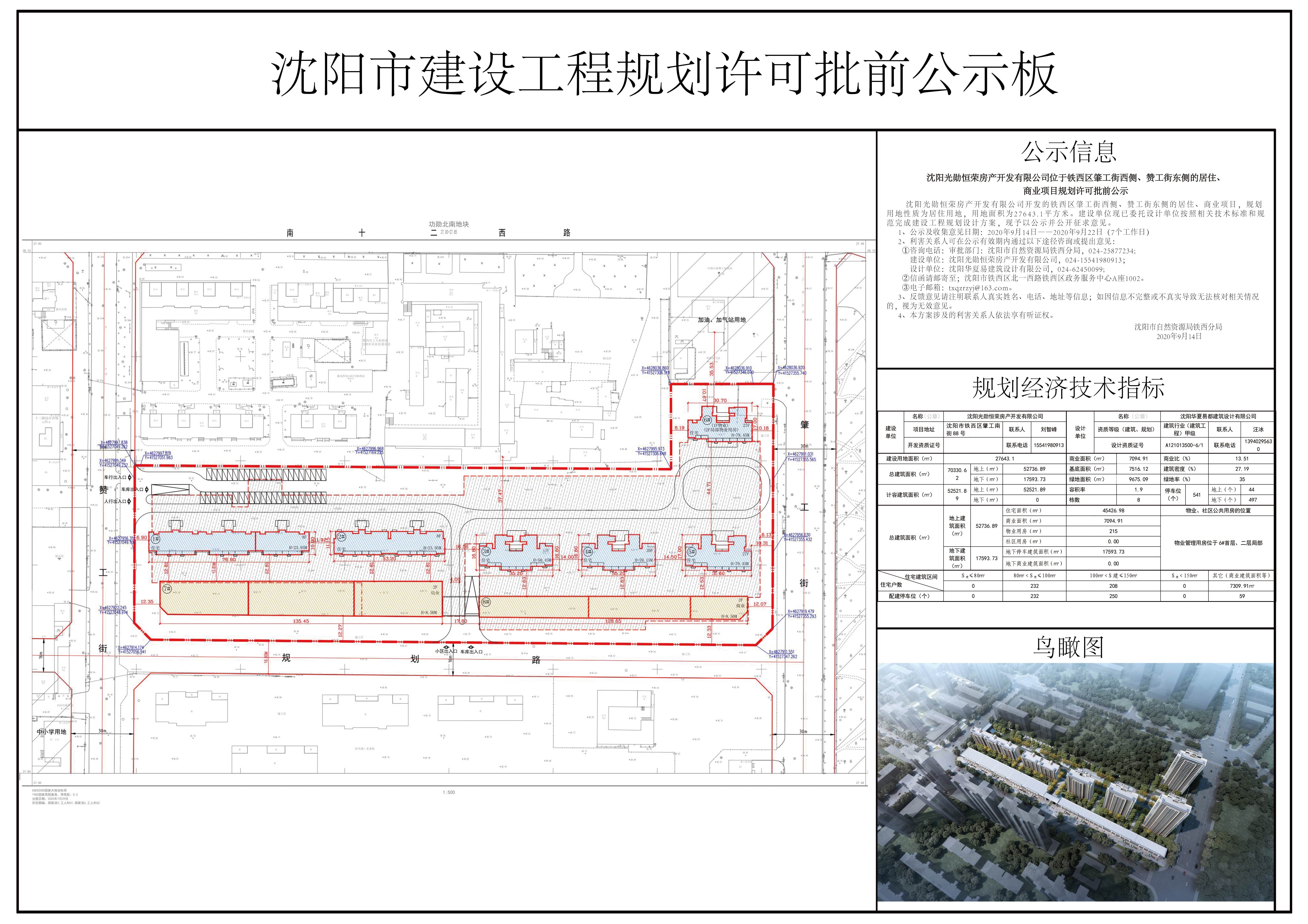 沈阳光勋恒荣房产开发有限公司开发的铁西区肇工街西侧、赞工街东侧的居住、商业项目,规划用地性质为居住用地,用地面积为27643.1平方米。建设单位现已委托设计单位按照相关技术标准和规范完成建设工程规划设计方案,现予以公示并公开征求意见。 1、公示及收集意见日期:2020年9月14日——2020年9月22日(7个工作日) 2、利害关系人可在公示有效期内通过以下途径咨询或提出意见: ①咨询电话:审批部门:沈阳市自然资源局铁西分局,024-25877234; 建设单位:沈阳光勋恒荣房产开发有限公司,024-15541980913; 设计单位:沈阳华夏易建筑设计有限公司,024-62450099; ②信函请邮寄至;沈阳市铁西区北一西路铁西区政务服务中心A座1002。 ③电子邮箱:txqzrzyj@163.com。 3、反馈意见请注明联系人真实姓名、电话、地址等信息;如因信息不完整或不真实导致无法核对相关情况的,视为无效意见。 4、本方案涉及的利害关系人依法享有听证权。