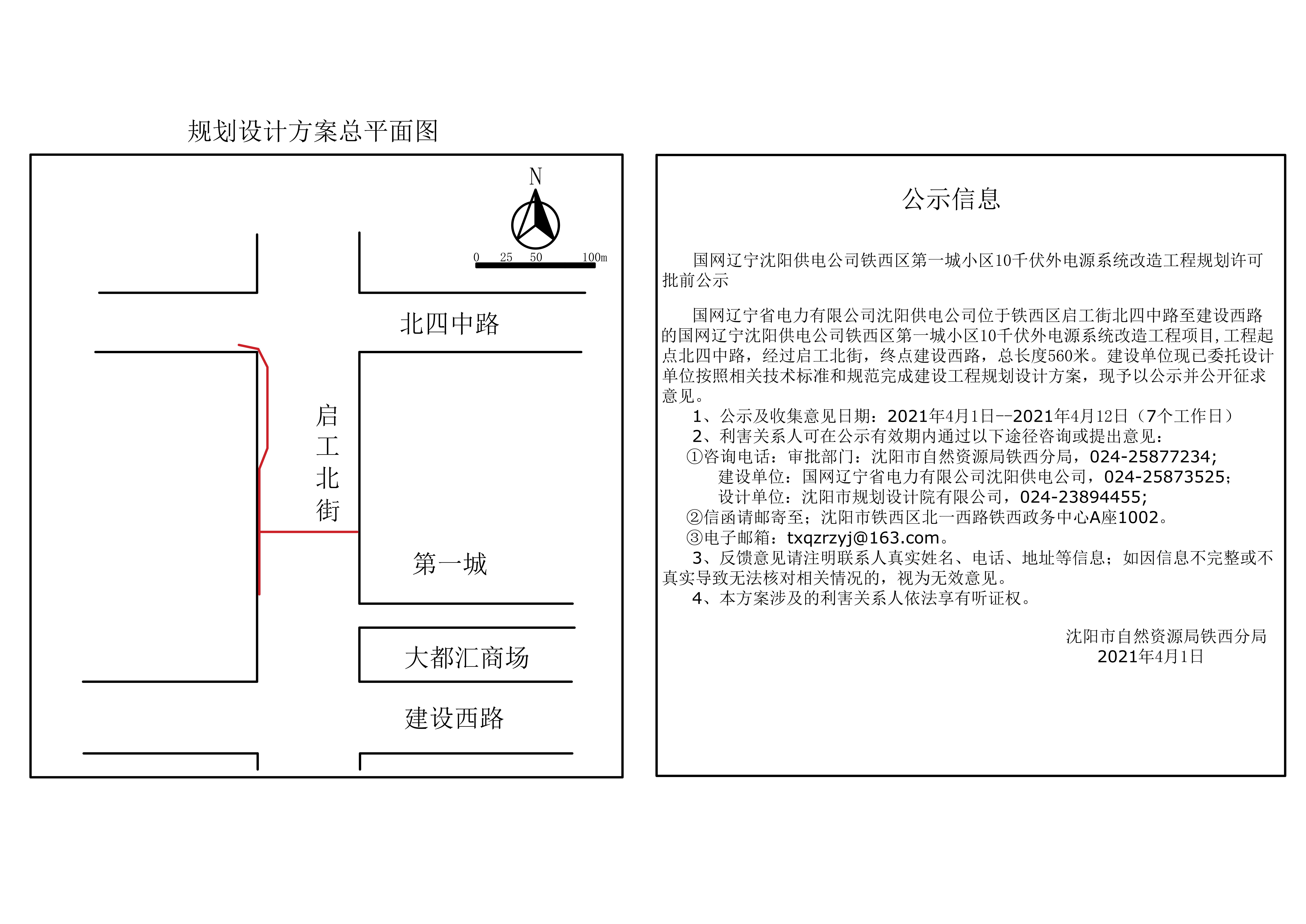 公示信息 国网辽宁沈阳供电公司铁西区第一城小区10千伏外电源系统改造工程规划许可批前公示 国网辽宁省电力有限公司沈阳供电公司位于铁西区启工街北四中路至建设西路的国网辽宁沈阳供电公司铁西区第一城小区10千伏外电源系统改造工程项目,工程起点北四中路,经过启工北街,终点建设西路,总长度560米。建设单位现已委托设计单位按照相关技术标准和规范完成建设工程规划设计方案,现予以公示并公开征求意见。 1、公示及收集意见日期:2021年4月1日--2021年4月12日(7个工作日) 2、利害关系人可在公示有效期内通过以下途径咨询或提出意见: ①咨询电话:审批部门:沈阳市自然资源局铁西分局,024-25877234; 建设单位:国网辽宁省电力有限公司沈阳供电公司,024-25873525; 设计单位:沈阳市规划设计院有限公司,024-23894455; ②信函请邮寄至;沈阳市铁西区北一西路铁西政务中心A座1002。 ③电子邮箱:txqzrzyj@163.com。 3、反馈意见请注明联系人真实姓名、电话、地址等信息;如因信息不完整或不真实导致无法核对相关情况的,视为无效意见。 4、本方案涉及的利害关系人依法享有听证权。