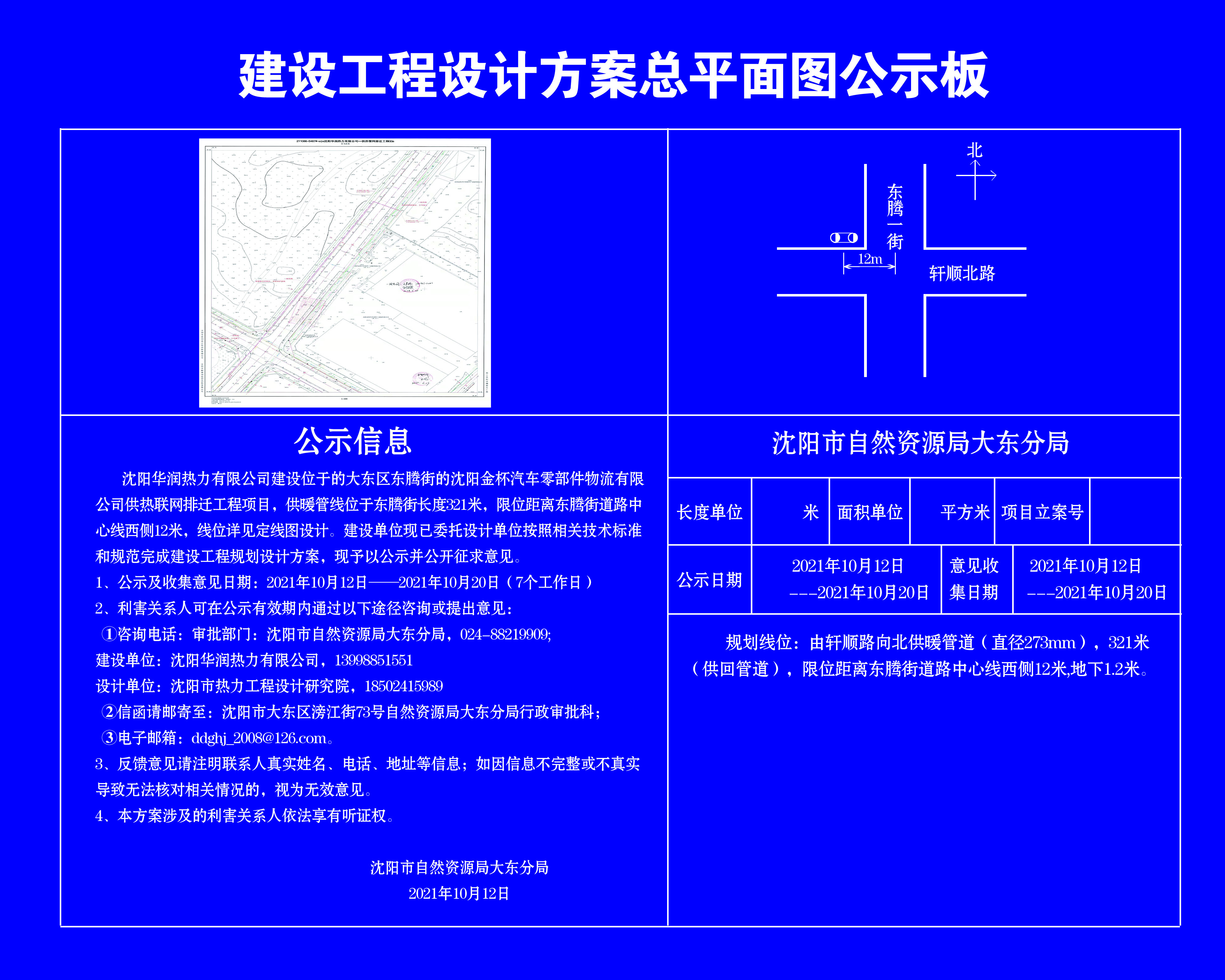 沈阳华润热力有限公司位于大东区东腾街的沈阳金杯汽车零部件物流有限公司 供热联网排迁工程项目规划许可批前公示 沈阳华润热力有限公司建设位于的大东区东腾街的沈阳金杯汽车零部件物流有限公司供热联网排迁工程项目,供暖管线位于东腾街长度321米,限位距离东腾街道路中心线西侧12米,详见定线图设计。建设单位现已委托设计单位按照相关技术标准和规范完成建设工程规划设计方案,现予以公示并公开征求意见。 1、公示及收集意见日期:2021年10月12日——2021年10月20日(7个工作日) 2、利害关系人可在公示有效期内通过以下途径咨询或提出意见: ①咨询电话:审批部门:沈阳市自然资源局大东分局,024-88219909; 建设单位:沈阳华润热力有限公司,13998851551 设计单位:沈阳市热力工程设计研究院,18502415989 ②信函请邮寄至:沈阳市大东区滂江街73号自然资源局大东分局行政审批科; ③电子邮箱:ddghj_2008@126.com。 3、反馈意见请注明联系人真实姓名、电话、地址等信息;如因信息不完整或不真实导致无法核对相关情况的,视为无效意见。 4、本方案涉及的利害关系人依法享有听证权。