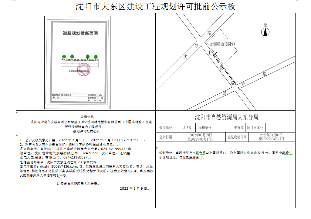 公示信息 沈阳电业电气安装有限公司承建-10kv沈阳锦逸置业有限公司(上园路东地块)变电所管线新建电力工程项目规划许可批前公示 1、公示及收集意见日期:2022年3月9日----2022年3月17日(7个工作日) 2、利害关系人可在公示有效期内通过以下途径咨询或提出意见: ①咨询电话:审批部门:沈阳市自然资源局大东分局,024-62199948; 建设单位:沈阳电业电气安装有限公司,024-95598; 设计单位:辽宁鑫汇电力工程设计有限公司,024-23180627; ②信函请邮寄至:沈阳市大东区清江街73号审批科。 ③电子邮箱:ddghj_2008@126.com。 3、反馈意见请注明联系人真实姓名、电话、地址等信息;如因信息不完整或不真实导致无法核对相关情况的,视为无效意见。 4、本方案涉及的利害关系人依法享有昕证权。