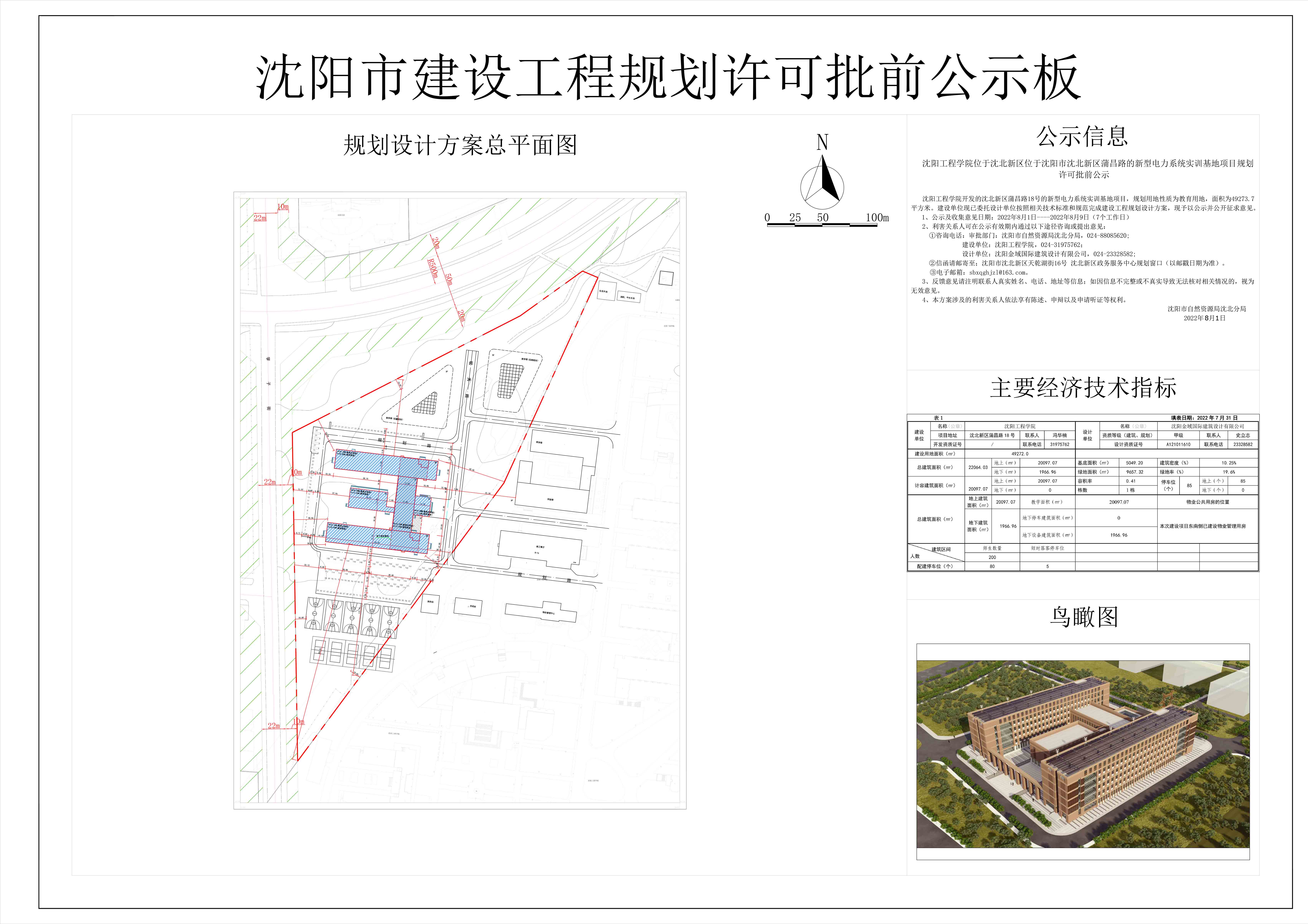 沈阳工程学院开发的沈北新区蒲昌路18号的新型电力系统实训基地项目,规划用地性质为科教用地,面积为49273.7平方米。建设单位现已委托设计单位按照相关技术标准和规范完成建设工程规划设计方案,现予以公示并公开征求意见。 1、公示及收集意见日期:2022年8月1日----2022年8月9日(7个工作日) 2、利害关系人可在公示有效期内通过以下途径咨询或提出意见: ①咨询电话:审批部门:沈阳市自然资源局沈北分局,024-88085620; 建设单位:沈阳工程学院,024-31975762; 设计单位:沈阳金域国际建筑设计有限公司,024-23328582; ②信函请邮寄至;沈阳市沈北新区天乾湖街16号 沈北新区政务服务中心规划窗口(以邮戳日期为准)。 ③电子邮箱:sbxqghjzl@163.com。 3、反馈意见请注明联系人真实姓名、电话、地址等信息;如因信息不完整或不真实导致无法核对相关情况的,视为无效意见。 4、本方案涉及的利害关系人依法享有陈述、申辩以及申请听证等权利。 沈阳市自然资源局沈北分局 2022年8月1日