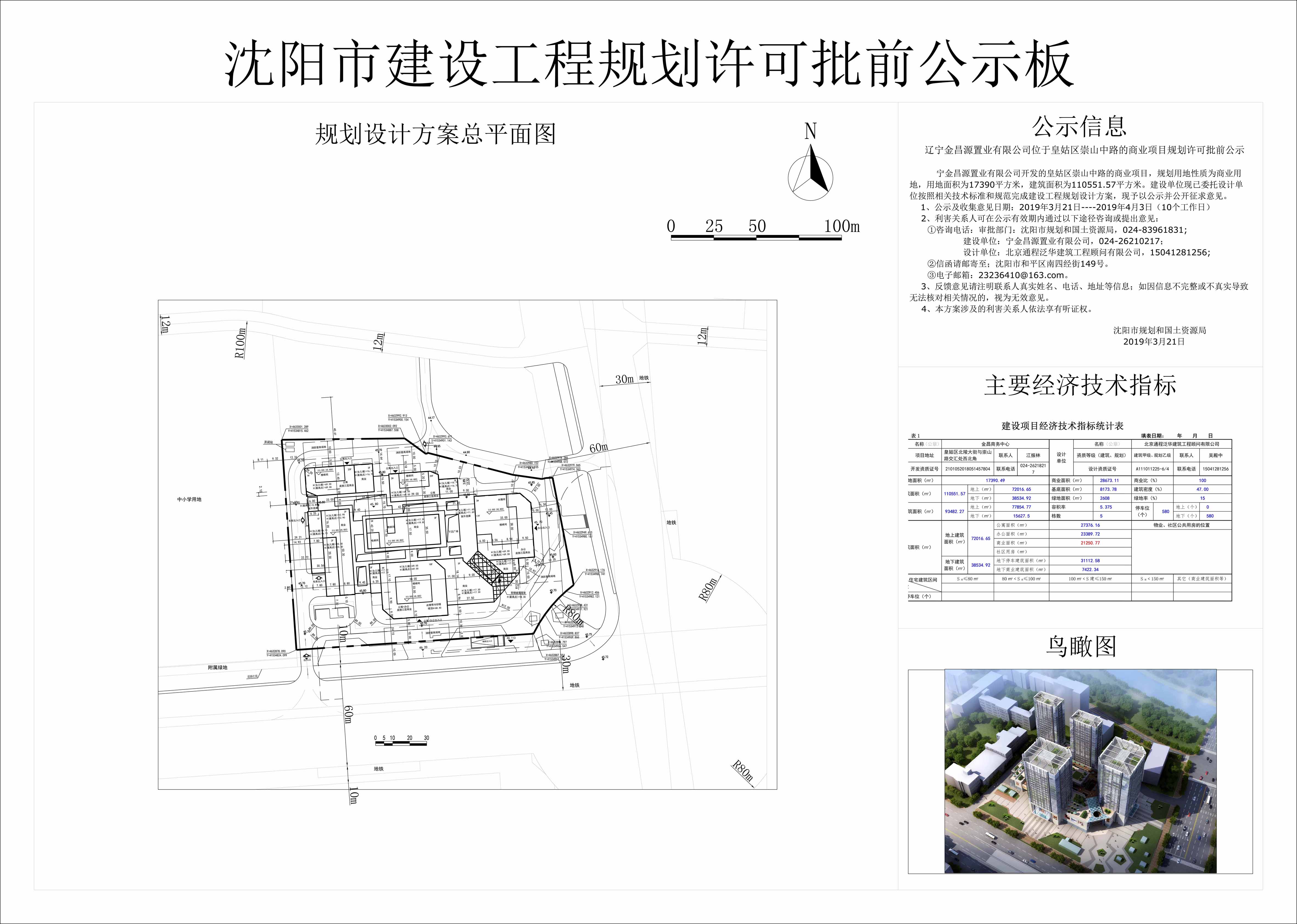 辽宁金昌源置业有限公司开发的皇姑区崇山中路的商业项目,规划用地性质为商业用地,用地面积为17390平方米,建筑面积约为110551.57平方米。建设单位现已委托设计单位按照相关技术标准和规范完成建设工程规划设计方案,现予以公示并公开征求意见。 1、公示及收集意见日期:2019年3月21日——2018年4月3日(10个工作日) 2、利害关系人可在公示有效期内通过以下途径咨询或提出意见: ①咨询电话:审批部门:沈阳市规划和国土资源局行政审批处,024-83961831; 建设单位:辽宁金昌源置业有限公司,024-26210217; 设计单位:北京通程泛华建筑工程顾问有限公司,15041281256; ②信函请邮寄至;沈阳市和平区南四经街149号。 ③电子邮箱:23236410@163.com。 3、反馈意见请注明联系人真实姓名、电话、地址等信息;如因信息不完整或不真实导致无法核对相关情况的,视为无效意见。 4、本方案涉及的利害关系人依法享有听证权。