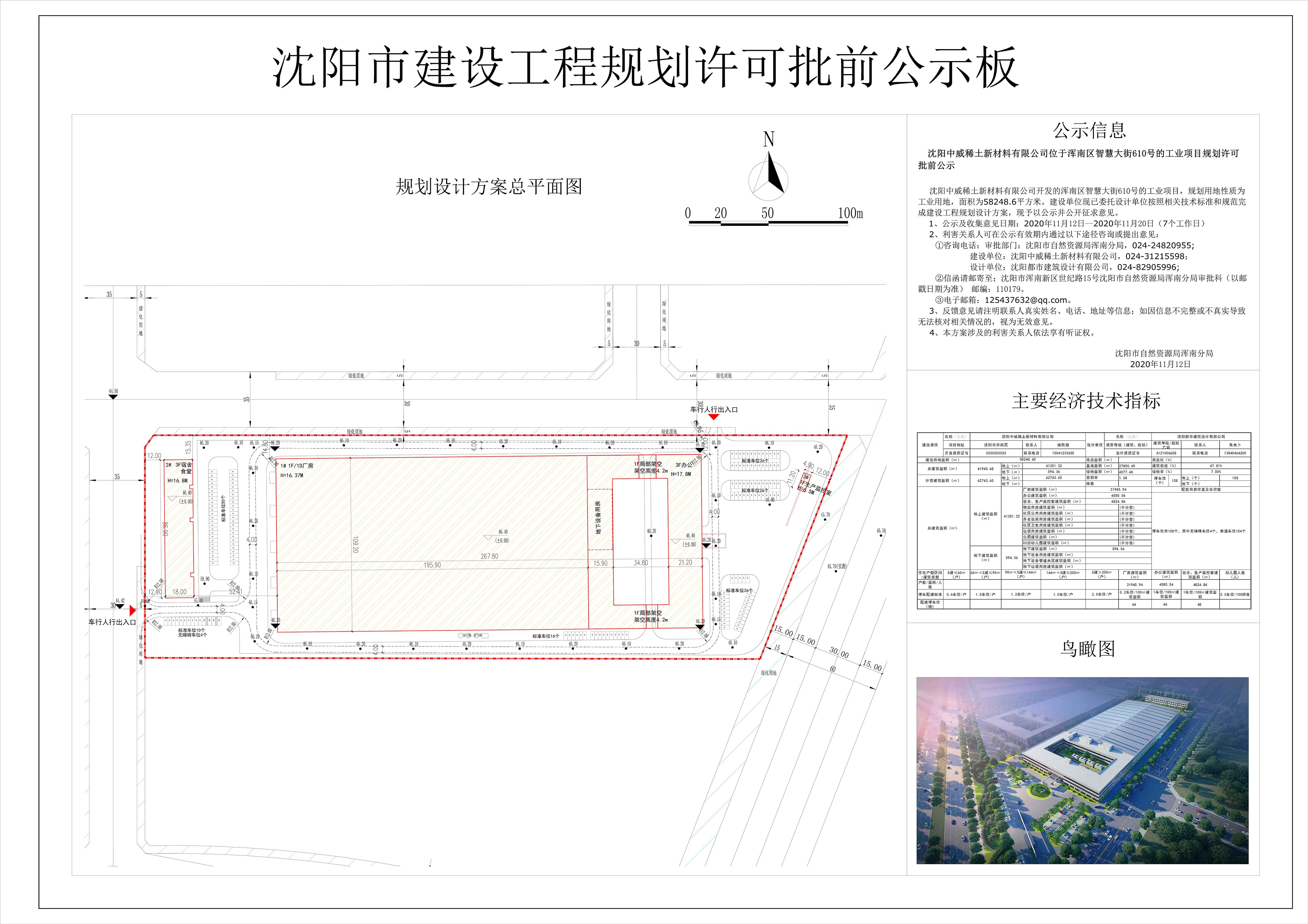 沈阳中威稀土新材料有限公司开发的浑南区智慧大街的工业项目,规划用地性质为工业用地,面积为58248.6平方米。建设单位现已委托设计单位按照相关技术标准和规范完成建设工程规划设计方案,现予以公示并公开征求意见。 1、公示及收集意见日期:2020年11月12日——2020年11月20日(7个工作日) 2、利害关系人可在公示有效期内通过以下途径咨询或提出意见: ①咨询电话:审批部门:沈阳市自然资源局浑南分局,024-24820955; 建设单位:沈阳中威稀土新材料有限公司,024-31215598; 设计单位:沈阳都市建筑设计有限公司,024-82905938; ②信函请邮寄至;沈阳市浑南新区世纪路15号沈阳市自然资源局浑南分局审批科(以邮戳日期为准) 邮编:110179。 ③电子邮箱:125437632@qq.com。 3、反馈意见请注明联系人真实姓名、电话、地址等信息;如因信息不完整或不真实导致无法核对相关情况的,视为无效意见。 4、本方案涉及的利害关系人依法享有听证权。