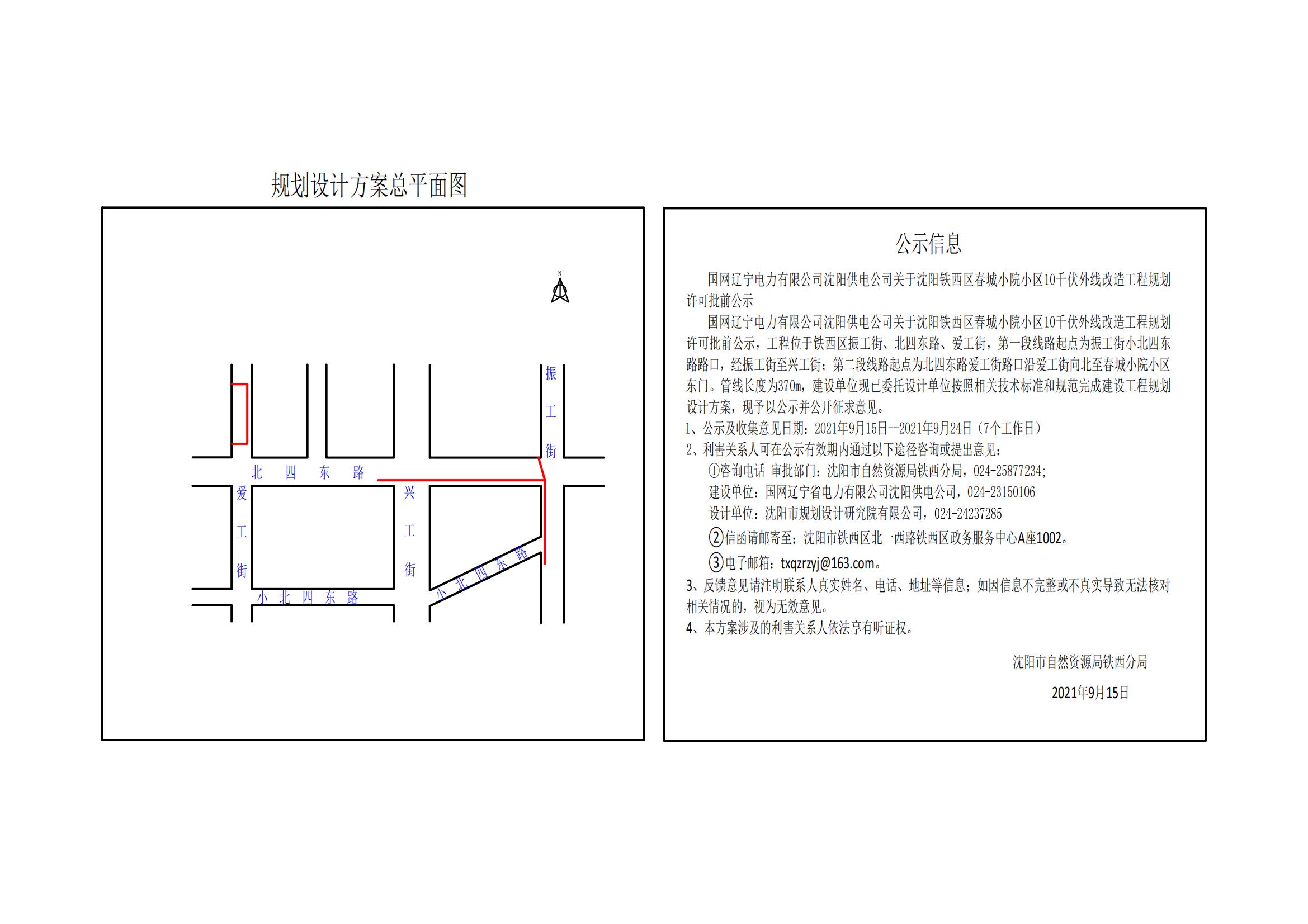 国网辽宁电力有限公司沈阳供电公司关于沈阳铁西区春城小院小区10千伏外线改造工程规划许可批前公示 国网辽宁电力有限公司沈阳供电公司关于沈阳铁西区春城小院小区10千伏外线改造工程规划许可批前公示,工程位于铁西区振工街、北四东路、爱工街,第一段线路起点为振工街小北四东路路口,经振工街至兴工街;第二段线路起点为北四东路爱工街路口沿爱工街向北至春城小院小区东门。管线长度为370m,建设单位现已委托设计单位按照相关技术标准和规范完成建设工程规划设计方案,现予以公示并公开征求意见。 1、公示及收集意见日期:2021年9月15日--2020年9月24日(7个工作日) 2、利害关系人可在公示有效期内通过以下途径咨询或提出意见: ①咨询电话 审批部门:沈阳市自然资源局铁西分局,024-25877234; 建设单位:国网辽宁省电力有限公司沈阳供电公司,024-23150106 设计单位:沈阳市规划设计研究院有限公司,024-24237285 ②信函请邮寄至;沈阳市铁西区北一西路铁西区政务服务中心A座1002。 ③电子邮箱:txqzrzyj@163.com。 3、反馈意见请注明联系人真实姓名、电话、地址等信息;如因信息不完整或不真实导致无法核对相关情况的,视为无效意见。 4、本方案涉及的利害关系人依法享有听证权。