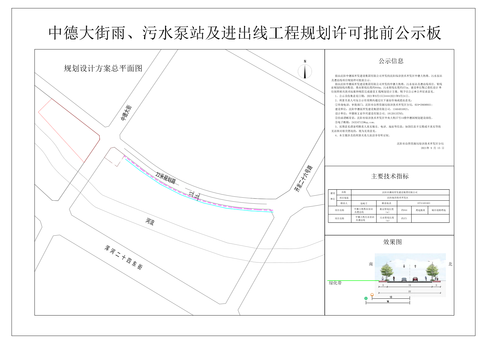 公示信息 中德大街雨、污水泵站及进出线项目规划许可批前公示 拟由沈阳中德园开发建设集团有限公司开发的中德大街雨、污水泵站及进出线项目。管线在规划绿线 内敷设,雨水管线长度约844m,污水管线长度约371m。建设单位现已委托设计单位按照相关技术标准和规范 完成建设工程规划设计方案,现予以公示并公开征求意见。 1、公示及收集意见日期:2021年9月15日——2021年9月24日 2、利害关系人可在公示有效期内通过以下途径咨询或提出意见: ①咨询电话:审批部门:沈阳市自然资源局经济技术开发区分局,024-28690931; 建设单位:沈阳中德园开发建设集团有限公司,13464016821; 设计单位:中国核工业华兴建设有限公司,18120135765; ②信函请邮寄至:沈阳市经济技术开发区中央大街27号14楼中德园规划建设部收。 ③电子邮箱:243247123@qq.com。 3、反馈意见请注明联系人真实姓名、电话、地址等信息;如因信息不完整或不真实导致无法 核对相关情况的,视为无效意见。 4、本方案涉及的利害关系人依法享有听证权。