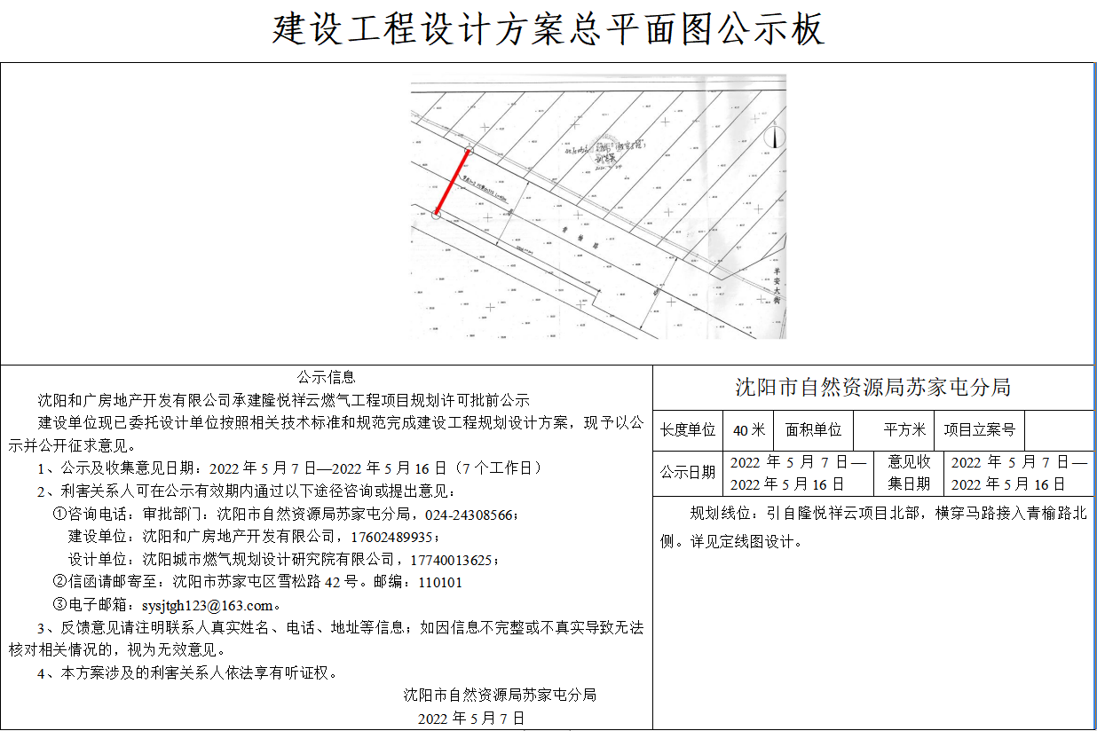 公示信息 沈阳和广房地产开发有限公司承建隆悦祥云燃气工程项目规划许可批前公示 建设单位现已委托设计单位按照相关技术标准和规范完成建设工程规划设计方案,现予以公示并公开征求意见。 1、公示及收集意见日期:2022年5月7日—2022年5月16日(7个工作日) 2、利害关系人可在公示有效期内通过以下途径咨询或提出意见: ①咨询电话:审批部门:沈阳市自然资源局苏家屯分局,024-24308566; 建设单位:沈阳和广房地产开发有限公司,17602489935; 设计单位:沈阳城市燃气规划设计研究院有限公司,17740013625; ②信函请邮寄至:沈阳市苏家屯区雪松路42号。邮编:110101 3、反馈意见请注明联系人真实姓名、电话、地址等信息;如因信息不完整或不真实导致无法核对相关情况的,视为无效意见。 4、本方案涉及的利害关系人依法享有听证权。 沈阳市自然资源局苏家屯分局 2022年5月7日