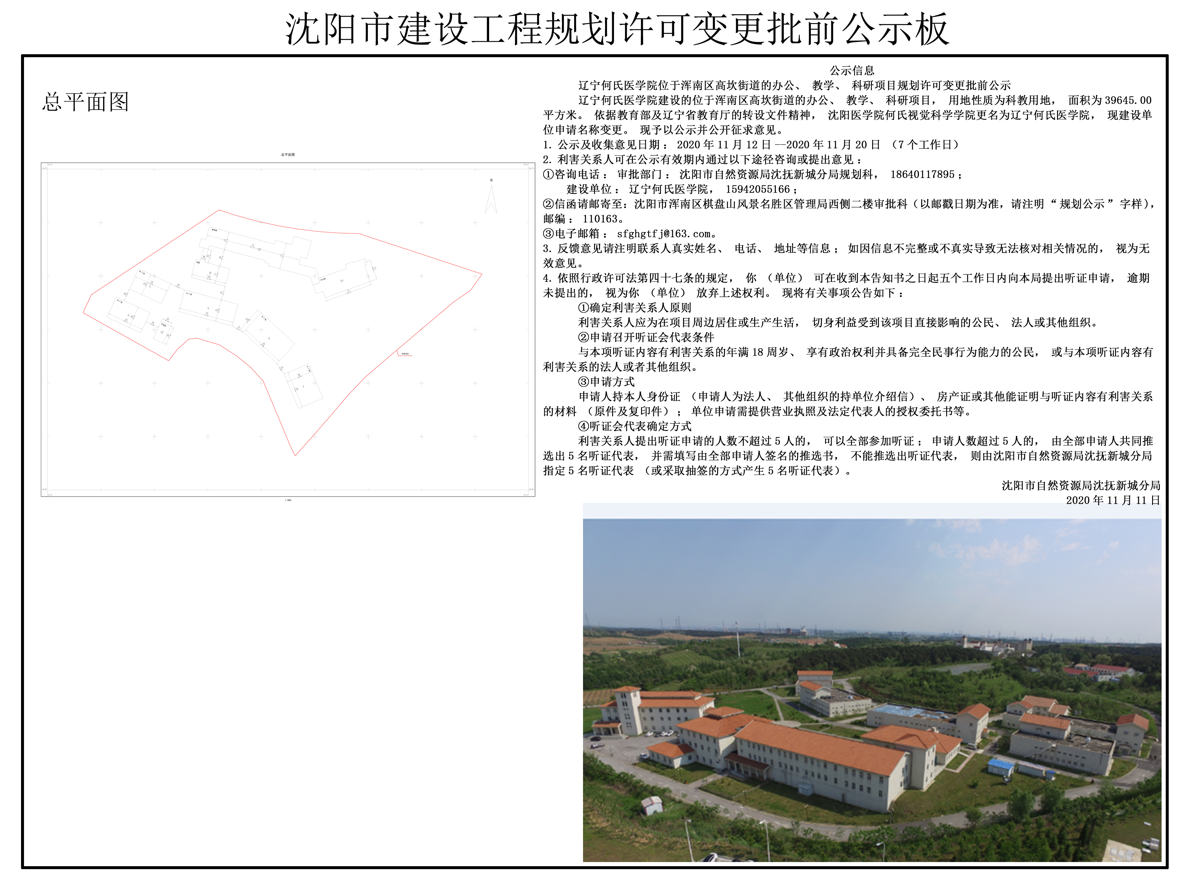 辽宁何氏医学院建设的位于浑南区高坎街道的办公、教学、科研项目,用地性质为科教用地,面积为39645.00平方米。依据教育部及辽宁省教育厅的转设文件精神,沈阳医学院何氏视觉科学学院更名为辽宁何氏医学院,现建设单位申请名称变更。现予以公示并公开征求意见。 1.公示及收集意见日期:2020年11月12日--2020年11月20日(7个工作日) 2.利害关系人可在公示有效期内通过以下途径咨询或提出意见: ①咨询电话:审批部门:沈阳市自然资源局沈抚新城分局规划科,18640117895; 建设单位:辽宁何氏医学院,15942055166; ②信函请邮寄至:沈阳市浑南区棋盘山风景名胜区管理局西侧二楼审批科(以邮戳日期为准,请注明“规划公示”字样),邮编:110163。 ③电子邮箱:sfghgtfj@163.com。 3.反馈意见请注明联系人真实姓名、电话、地址等信息;如因信息不完整或不真实导致无法核对相关情况的,视为无效意见。 4.依照行政许可法第四十七条的规定,你(单位)可在收到本告知书之日起五个工作日内向本局提出听证申请,逾期未提出的,视为你(单位)放弃上述权利。现将有关事项公告如下: ①确定利害关系人原则 利害关系人应为在项目周边居住或生产生活,切身利益受到该项目直接影响的公民、法人或其他组织。 ②申请召开听证会代表条件 与本项听证内容有利害关系的年满18周岁、享有政治权利并具备完全民事行为能力的公民,或与本项听证内容有利害关系的法人或者其他组织。 ③申请方式 申请人持本人身份证(申请人为法人、其他组织的持单位介绍信)、房产证或其他能证明与听证内容有利害关系的材料(原件及复印件);单位申请需提供营业执照及法定代表人的授权委托书等。 ④听证会代表确定方式 利害关系人提出听证申请的人数不超过5人的,可以全部参加听证;申请人数超过5人的,由全部申请人共同推选出5名听证代表,并需填写由全部申请人签名的推选书,不能推选出听证代表,则由沈阳市自然资源局沈抚新城分局指定5名听证代表(或采取抽签的方式产生5名听证代表)。
