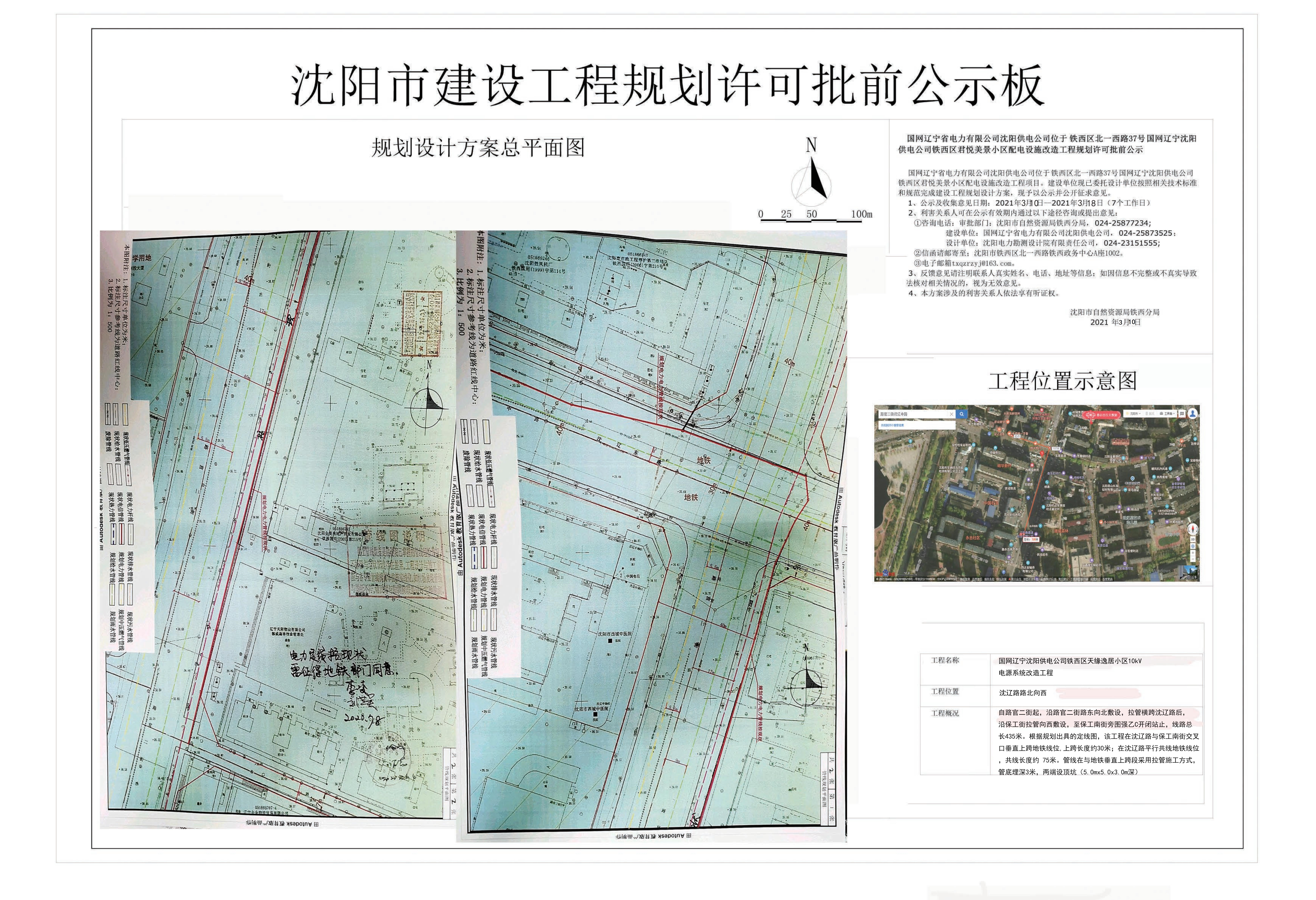 国网辽宁省电力有限公司沈阳供电公司位于铁西区北一西路37号国网辽宁沈阳供电公司君悦美景小区配电设施改造工程项目。建设单位现已委托设计单位按照相关技术标准和规范完成建设工程规划设计方案,现予以公示并公开征求意见。 1、公示及收集意见日期:2021年3月10日--2021年3月18日(7个工作日) 2、利害关系人可在公示有效期内通过以下途径咨询或提出意见: ①咨询电话:审批部门:沈阳市自然资源局铁西分局,024-25877234; 建设单位:国网辽宁省电力有限公司沈阳供电公司,024-25873525; 设计单位:沈阳电力勘测设计院有限责任公司,024-23151555; ②信函请邮寄至;沈阳市铁西区北一西路铁西政务中心A座1002。 ③电子邮箱:txqzrzyj@163.com。 3、反馈意见请注明联系人真实姓名、电话、地址等信息;如因信息不完整或不真实导致无法核对相关情况的,视为无效意见。 4、本方案涉及的利害关系人依法享有听证权。