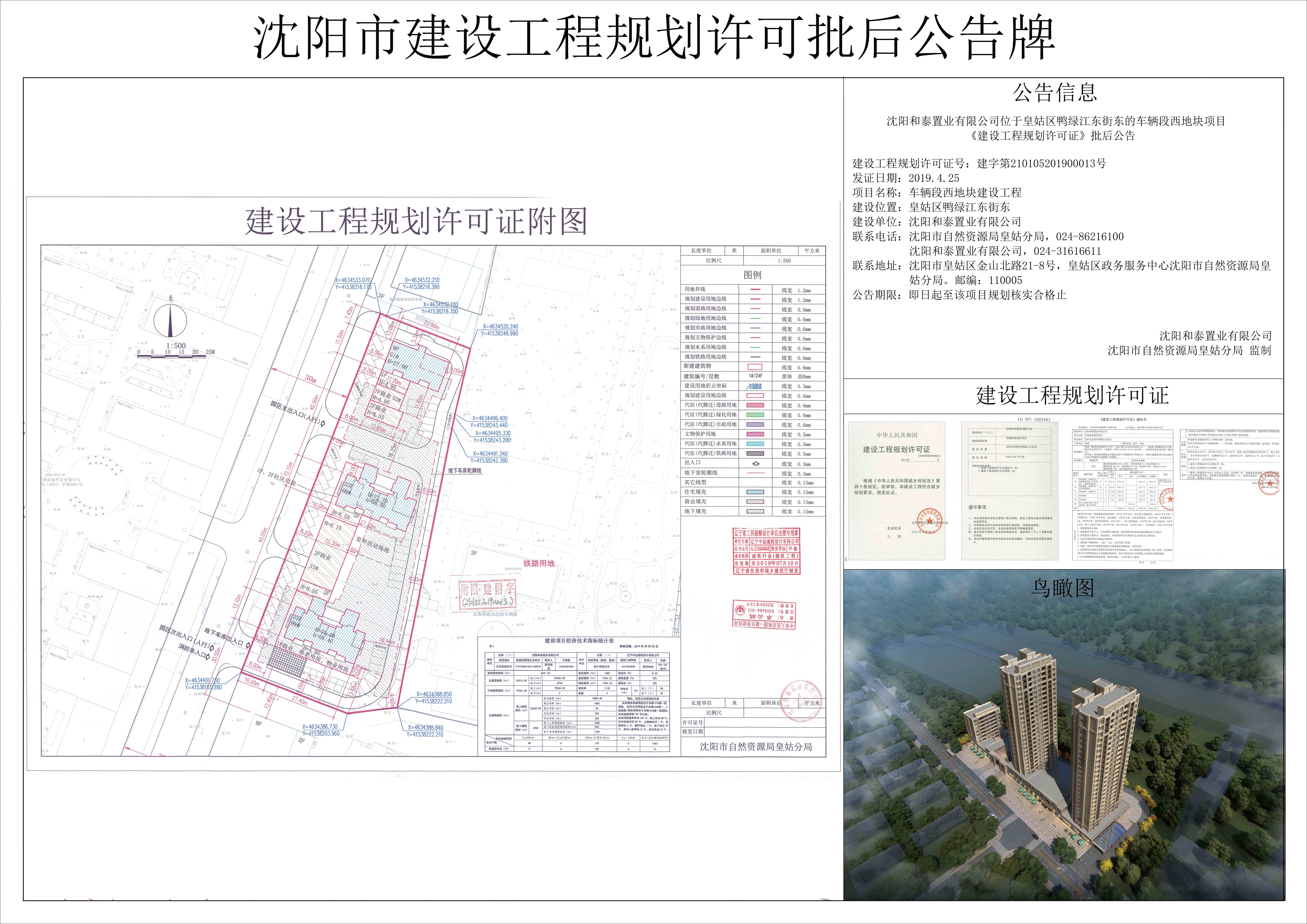 沈阳和泰置业有限公司位于皇姑区鸭绿江东街东的车辆段西地块项目《建设工程规划许可证》批后公告 建设工程规划许可证号:建字第210105201900013号 沈阳和泰置业有限公司