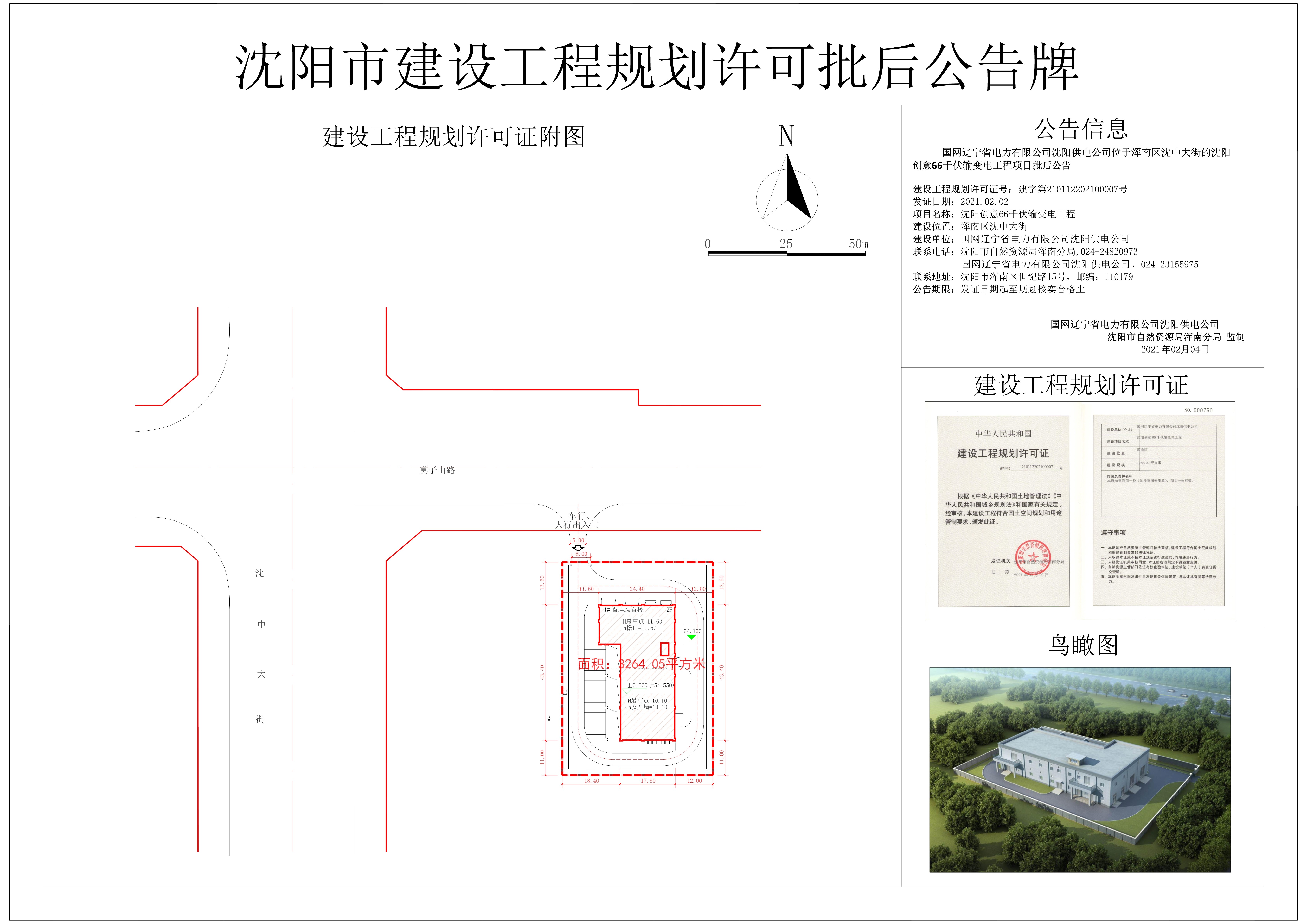 建设工程规划许可证号:建字第210112202100007号 发证日期:2021.02.02 项目名称:沈阳创意66千伏输变电工程 建设位置:浑南区沈中大街 建设单位:国网辽宁省电力有限公司沈阳供电公司 公示期限:即日起至该项目规划核实合格止。 联系电话:沈阳市自然资源局浑南分局,024-24820973; 国网辽宁省电力有限公司沈阳供电公司,024-23155975 联系地址:沈阳市浑南区世纪路15号,邮编:110179