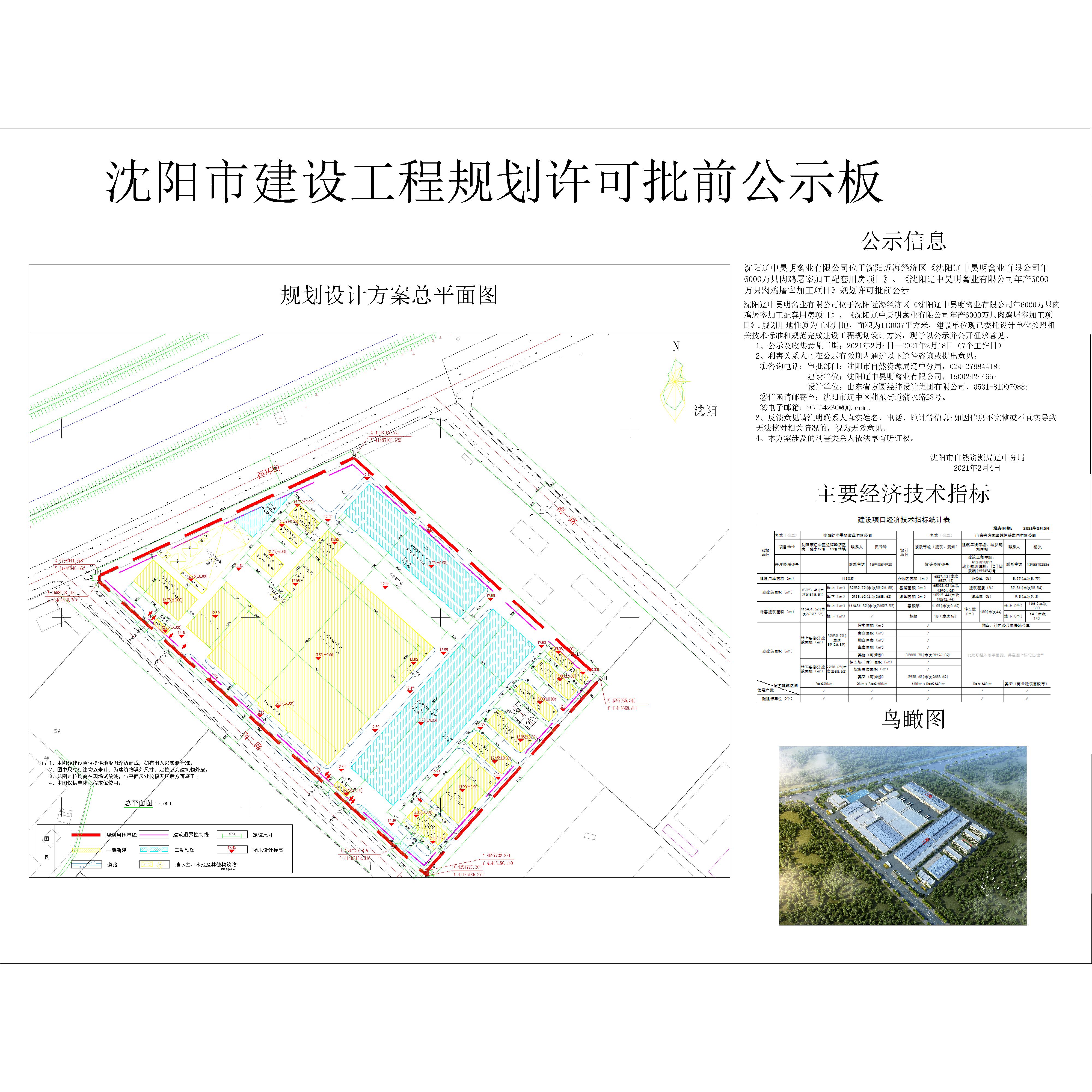 沈阳辽中昊明禽业有限公司位于沈阳近海经济区《沈阳辽中昊明禽业有限公司年6000万只肉鸡屠宰加工配套用房项目》、《沈阳辽中昊明禽业有限公司年产6000万只肉鸡屠宰加工项目》规划许可批前公示 沈阳辽中昊明禽业有限公司位于沈阳近海经济区《沈阳辽中昊明禽业有限公司年6000万只肉鸡屠宰加工配套用房项目》、《沈阳辽中昊明禽业有限公司年产6000万只肉鸡屠宰加工项目》,规划用地性质为工业用地,面积为113037平方米,建设单位现已委托设计单位按照相关技术标准和规范完成建设工程规划设计方案,现予以公示并公开征求意见。 1、公示及收集意见日期:2021年2月4日--2021年2月18日(7个工作日) 2、利害关系人可在公示有效期内通过以下途径咨询或提出意见: ①咨询电话:审批部门:沈阳市自然资源局辽中分局,024-27884418; 建设单位:沈阳辽中昊明禽业有限公司,15002424465; 设计单位:山东省方圆经纬设计集团有限公司,0531-81907088; ②信函请邮寄至:沈阳市辽中区蒲东街道蒲水路28号。 ③电子邮箱:95154230@QQ.com。 3、反馈意见请注明联系人真实姓名、电话、地址等信息;如因信息不完整或不真实导致 无法核对相关情况的,视为无效意见。 4、本方案涉及的利害关系人依法享有听证权。