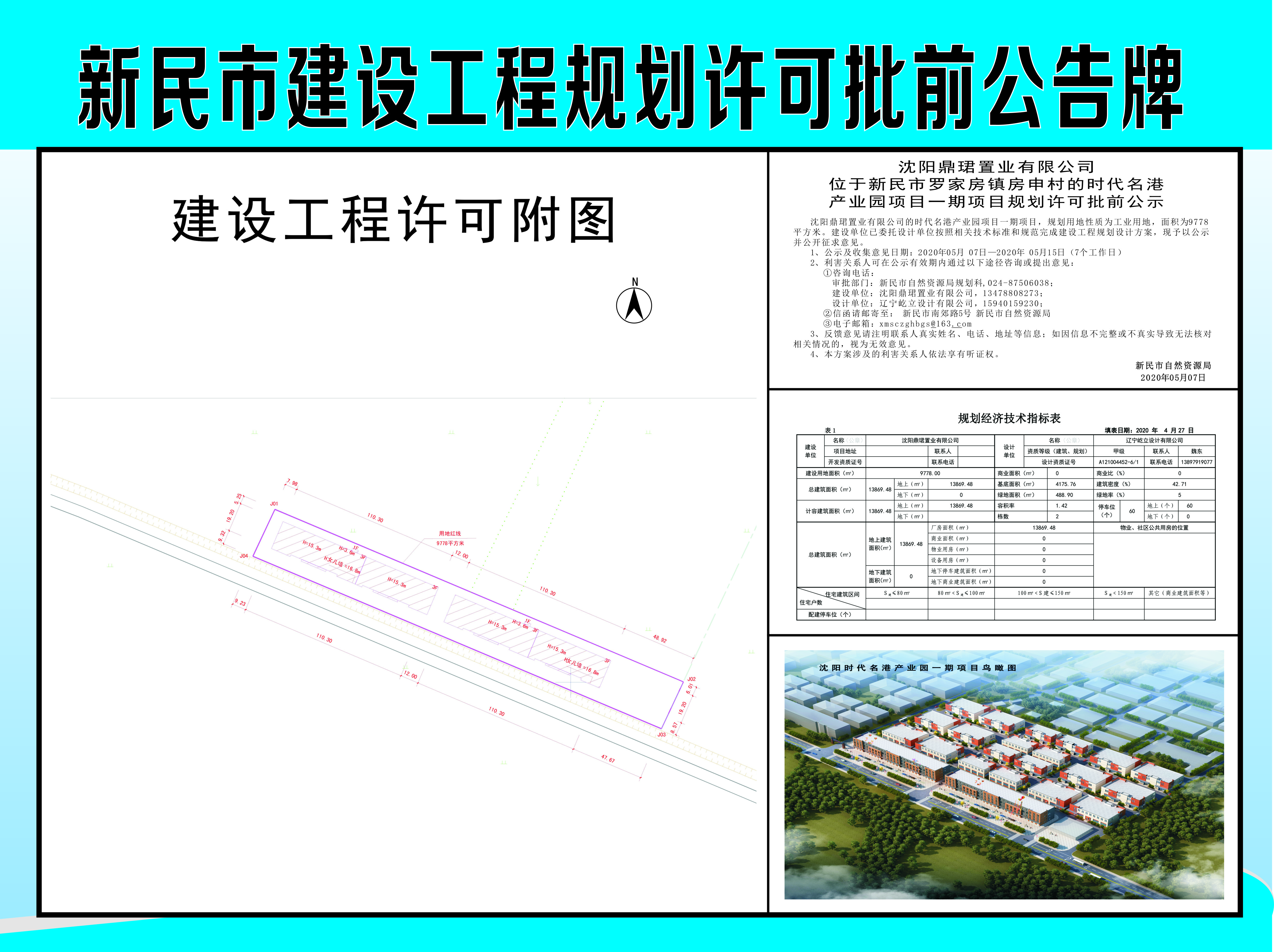 沈阳鼎珺置业有限公司位于 新民市罗家房镇房申村的时代名 港产业园项目一期项目规划许可批前公示