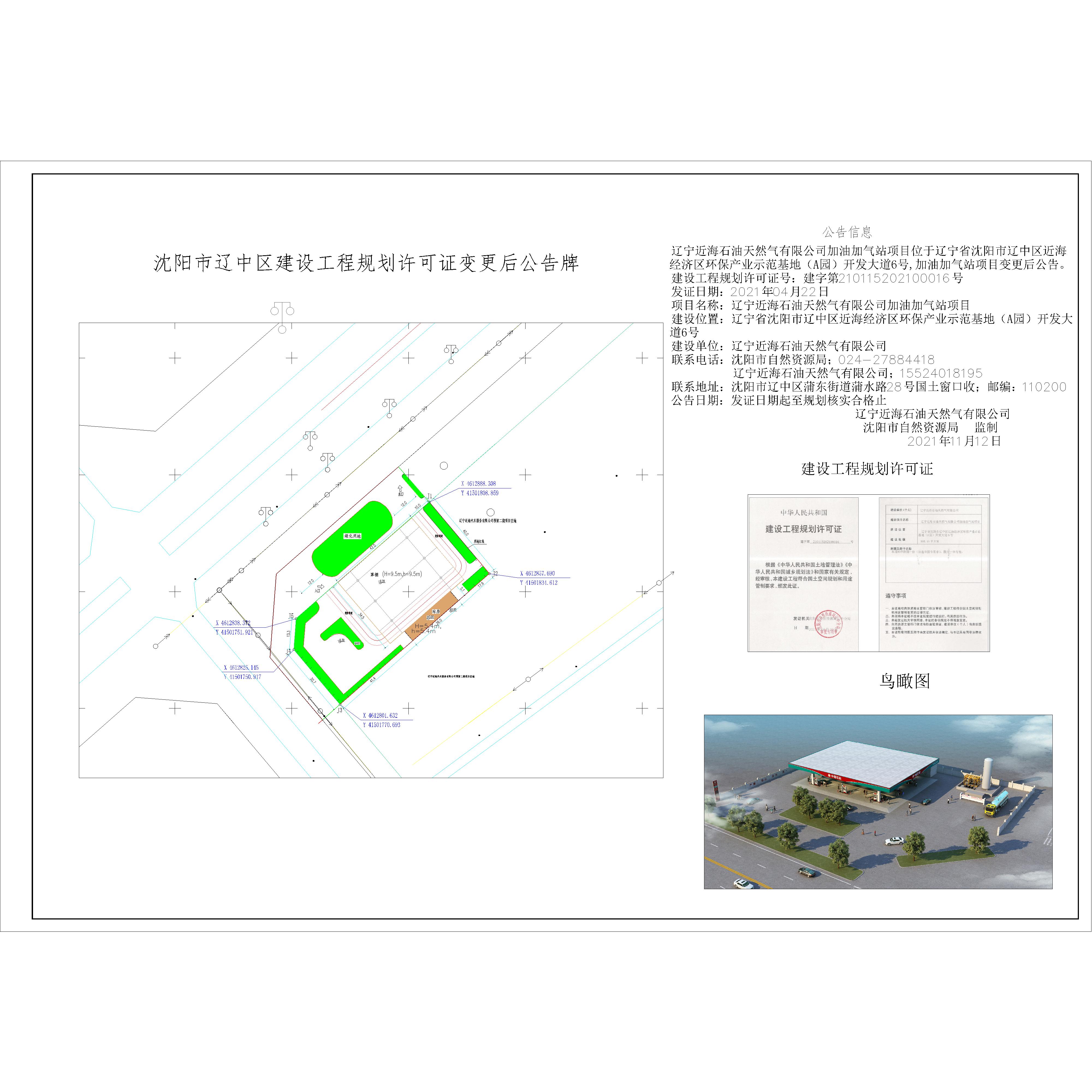 公告信息 辽宁近海石油天然气有限公司加油加气站项目位于辽宁省沈阳市辽中区近海经济区环保产业示范基地(A园)开发大道6号,加油加气站项目变更后公告。 建设工程规划许可证号:建字第210115202100016号 发证日期:2021年04月22日 项目名称:辽宁近海石油天然气有限公司加油加气站项目 建设位置:辽宁省沈阳市辽中区近海经济区环保产业示范基地(A园)开发大道6号 建设单位:辽宁近海石油天然气有限公司 联系电话:沈阳市自然资源局;024-27884418 辽宁近海石油天然气有限公司;15524018195 联系地址:沈阳市辽中区蒲东街道蒲水路28号国土窗口收;邮编:110200 公告日期:发证日期起至规划核实合格止 辽宁近海石油天然气有限公司 沈阳市自然资源局 监制 2021年11月12日