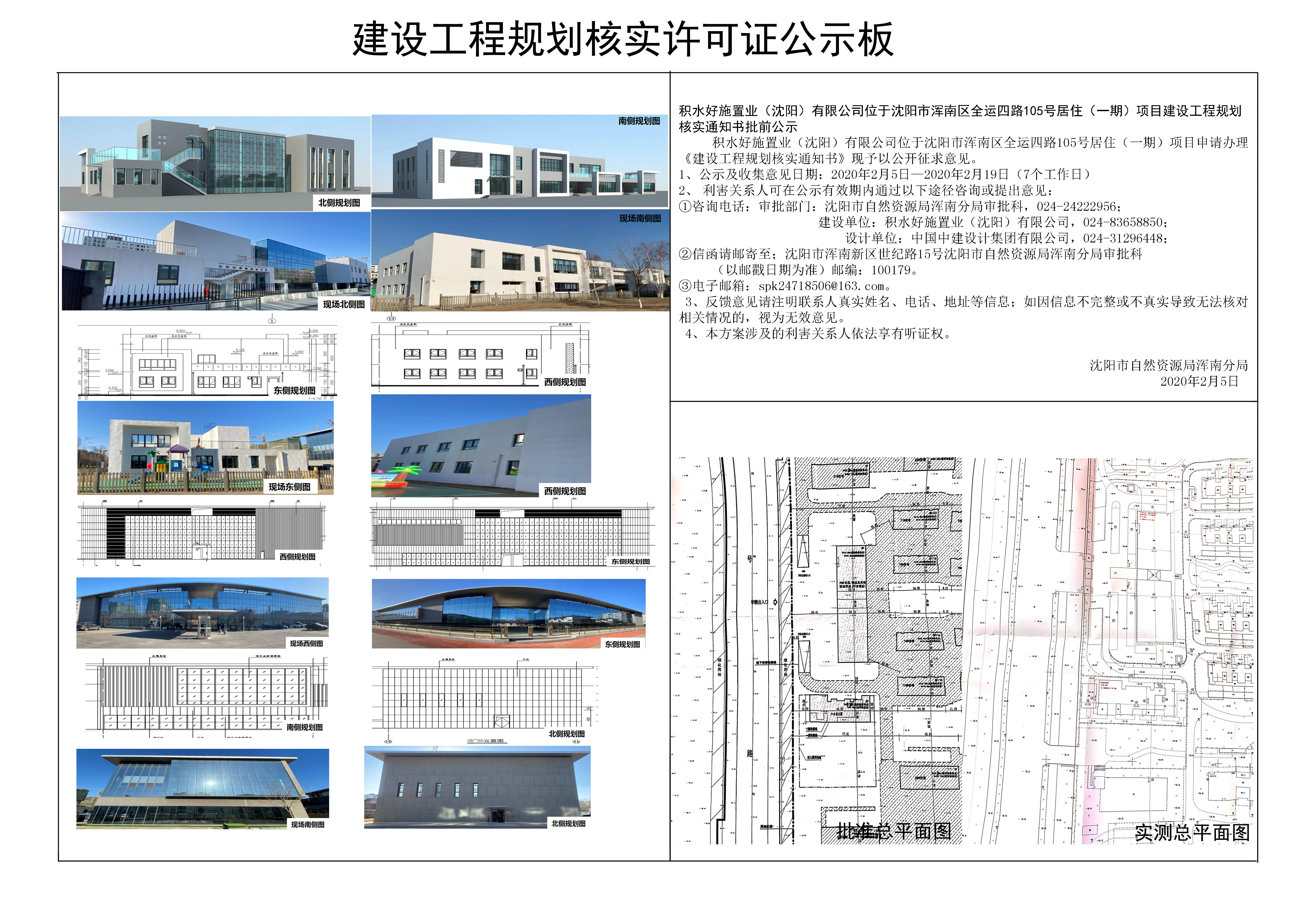 积水好施置业(沈阳)有限公司位于沈阳市浑南区全运四路105号居住(一期)项目申请办理《建设工程规划核实通知书》现予以公开征求意见。 1、公示及收集意见日期:2020年2月5日—2020年2月19日(7个工作日) 2、利害关系人可在公示有效期内通过以下途径咨询或提出意见: ①咨询电话:审批部门:沈阳市自然资源局浑南分局审批科,024-24222956; 建设单位:积水好施置业(沈阳)有限公司,024-83658850; 设计单位:中国中建设计集团有限公司,024-31296448; ②信函请邮寄至;沈阳市浑南新区世纪路15号沈阳市自然资源局浑南分局审批科 (以邮戳日期为准)邮编:100179。 ③电子邮箱:spk24718506@163.com。 3、反馈意见请注明联系人真实姓名、电话、地址等信息;如因信息不完整或不真实导致无法核对相关情况的,视为无效意见。 4、本方案涉及的利害关系人依法享有听证权。