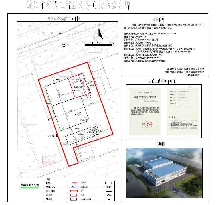 沈阳华夏东银汽车销售服务有限公司位于沈阳市于洪区沈大路83甲-1号 的广汽丰田4S店扩建工程项目批后公告《建设工程规划许可证》批后公告