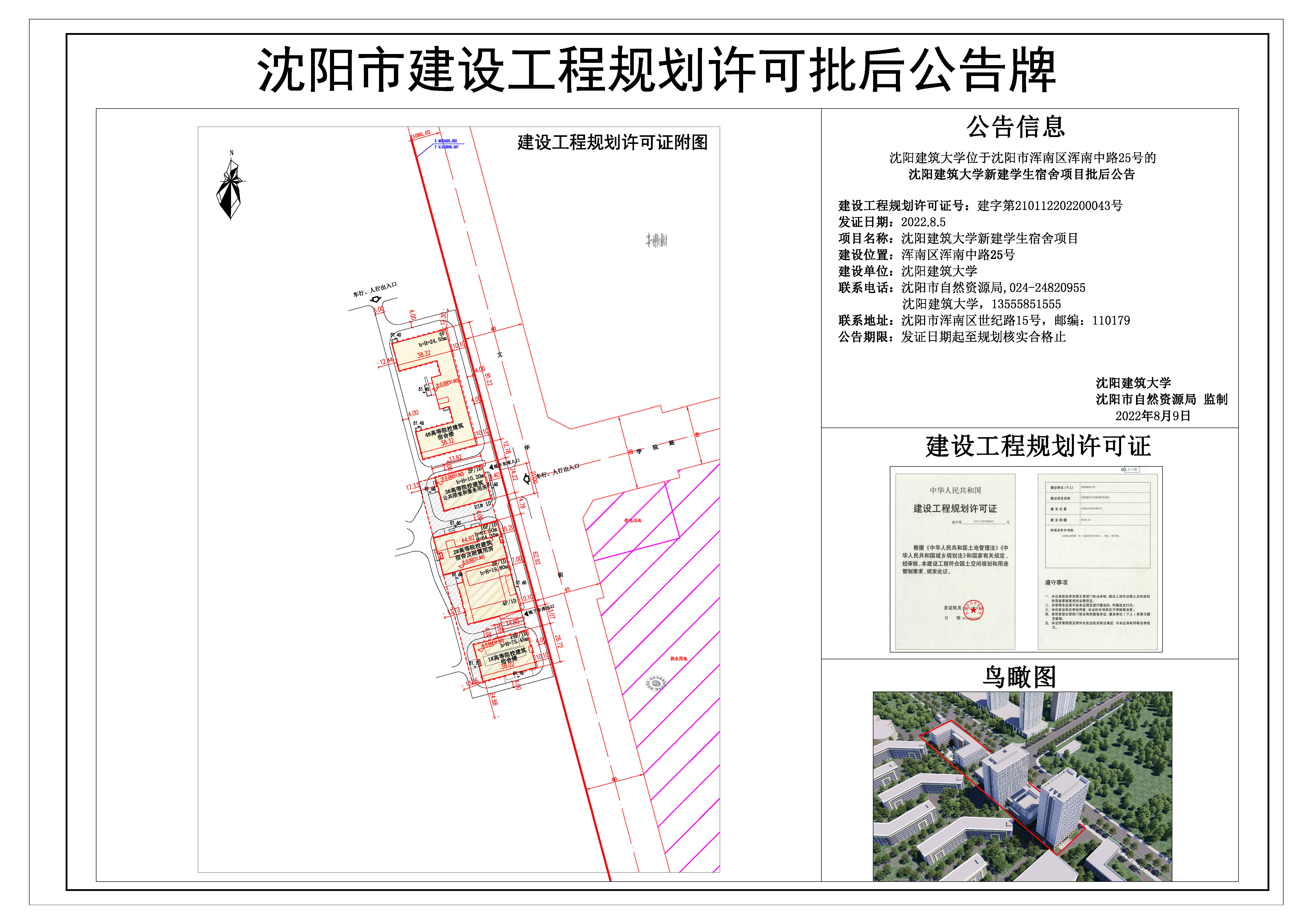 建设工程规划许可证号:建字第210112202200043号 发证日期:2022.8.5 项目名称:沈阳建筑大学新建学生宿舍项目 建设位置:浑南区浑南中路25号 建设单位:沈阳建筑大学 公示期限:即日起至该项目规划核实合格止。 联系电话:沈阳市自然资源局浑南分局,024-24820955; 沈阳建筑大学,13555851555 联系地址:沈阳市浑南区世纪路15号,邮编:110179