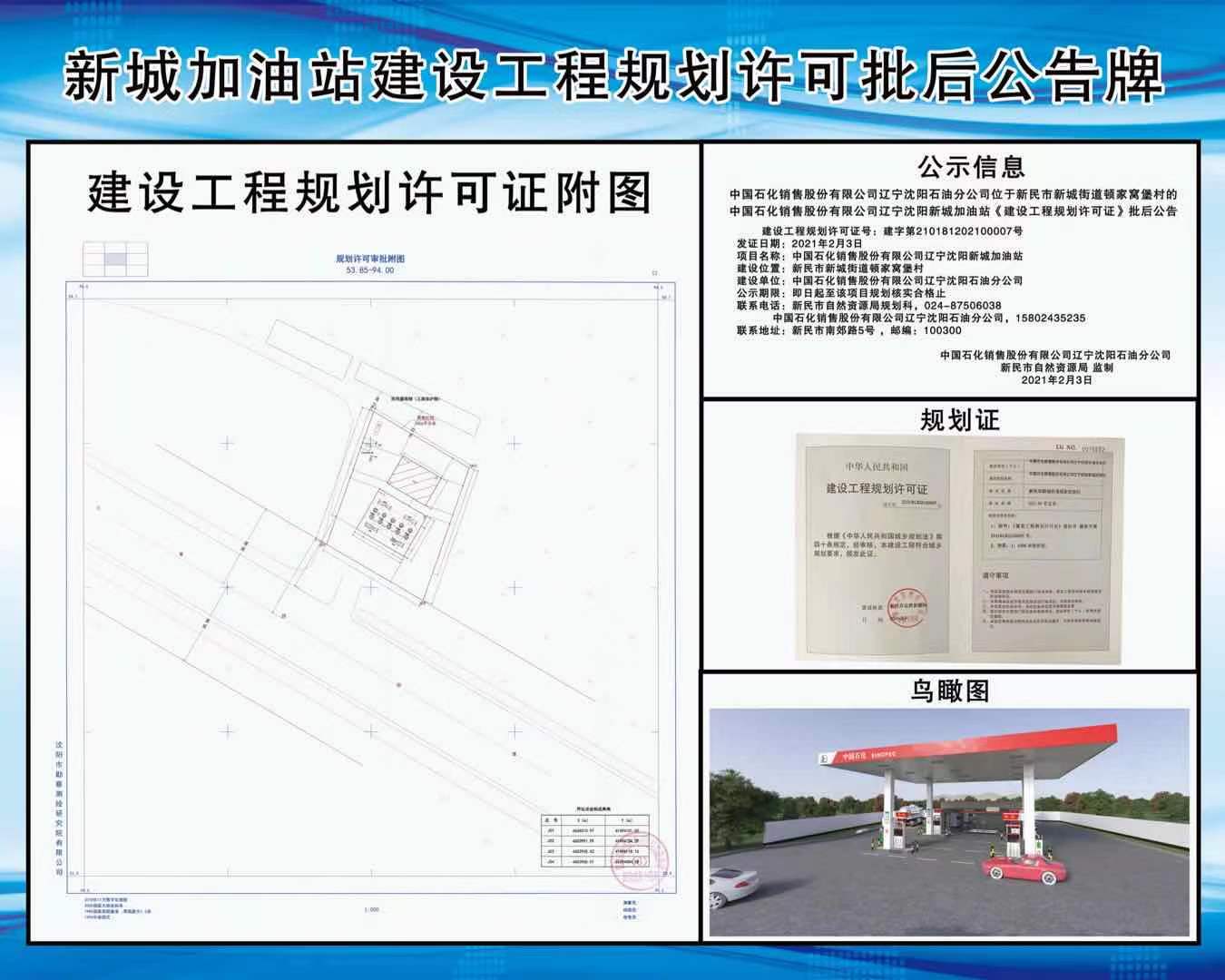 中国石化销售股份有限公司辽宁沈阳石油分公司位于新民市新城街道顿家窝堡村的中国石化销售股份有限公司辽宁沈阳新城加油站《建设工程规划许可证》批后公告