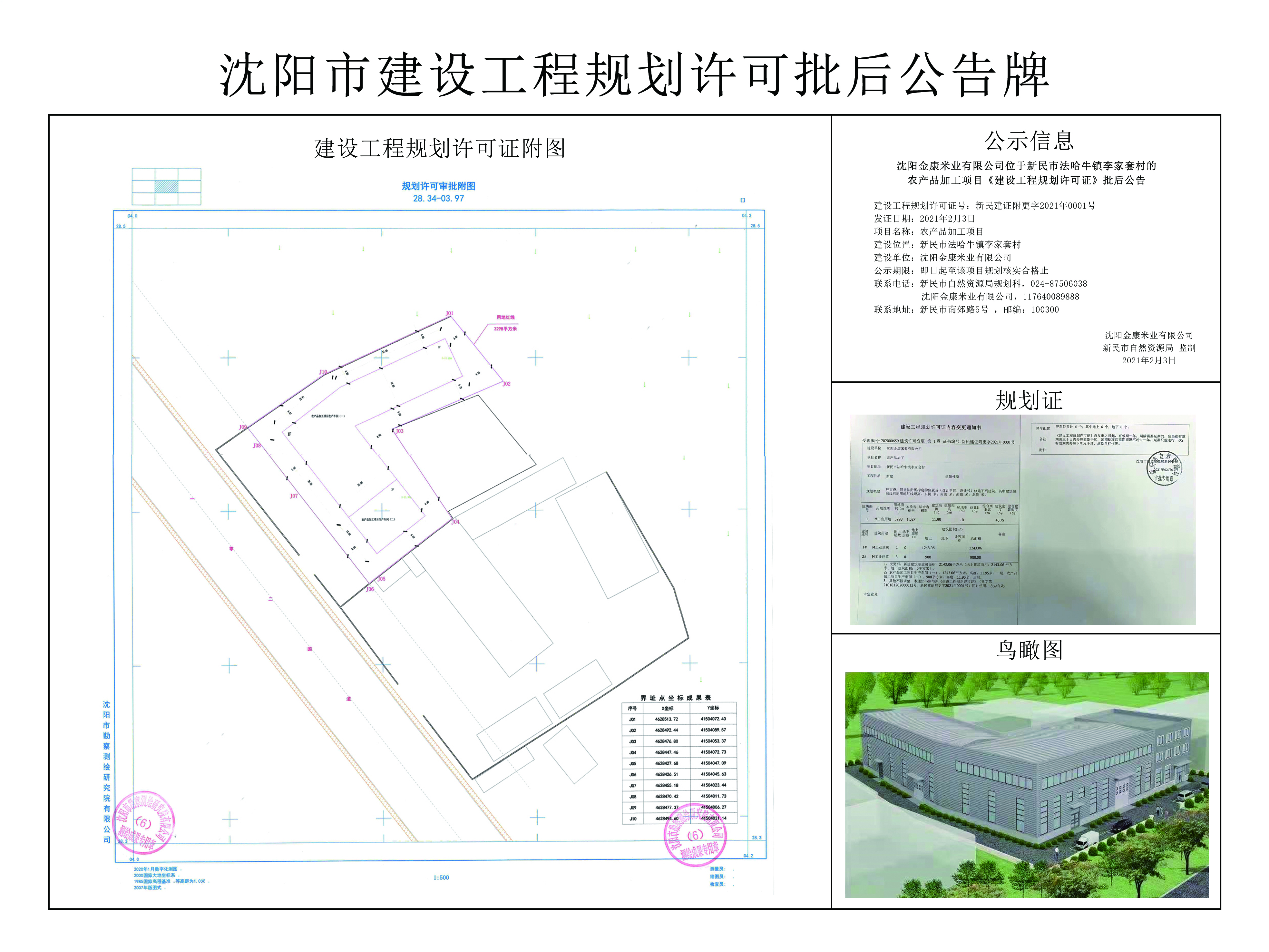 沈阳金康米业有限公司位于新民市法哈牛镇李家套村的农产品加工项目《建设工程规划许可证》批后公告