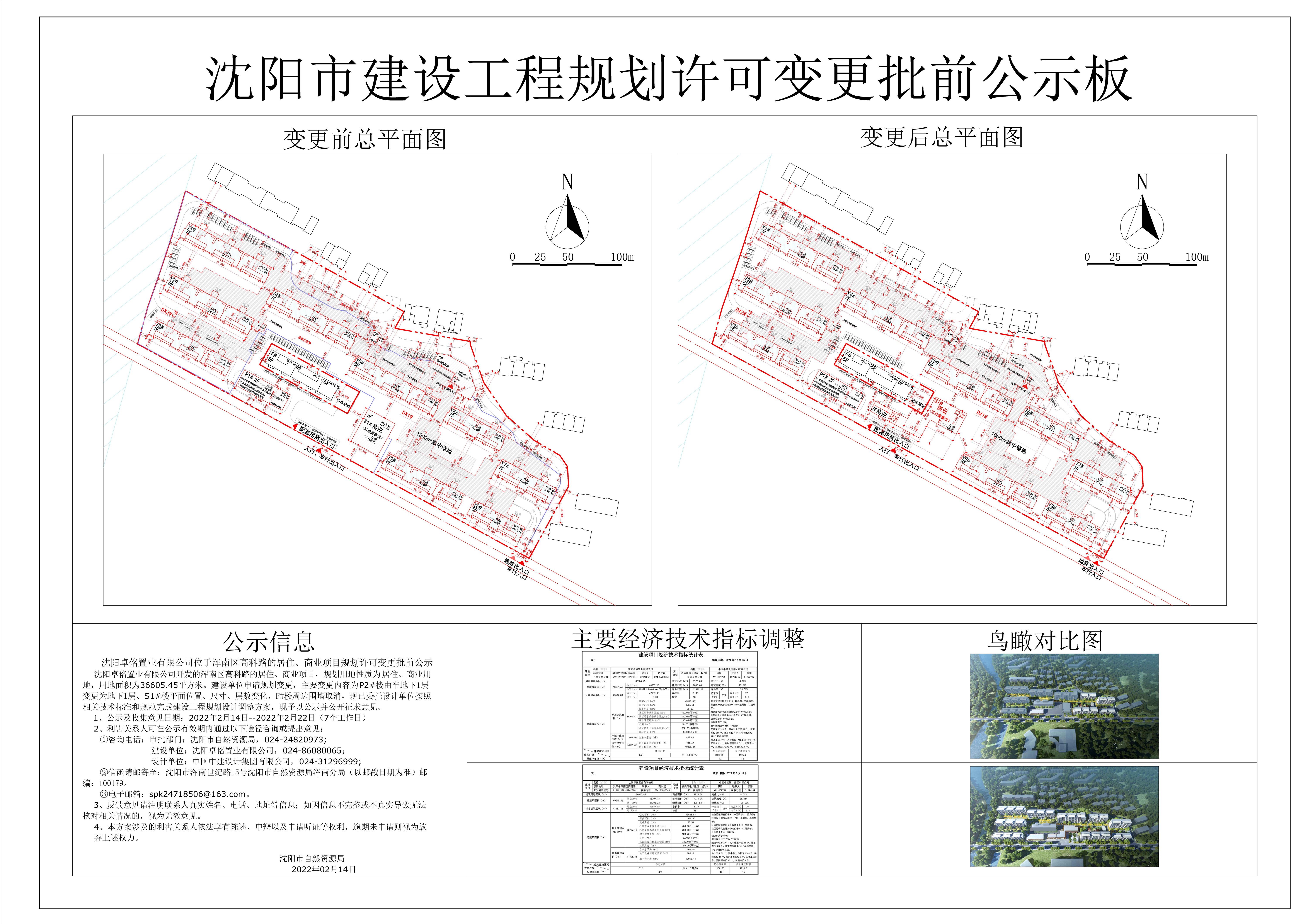 沈阳卓佲置业有限公司位于浑南区高科路的居住、商业项目规划许可变更批前公示 沈阳卓佲置业有限公司开发的浑南区高科路的居住、商业项目,规划用地性质为居住、商业用地,用地面积为36605.45平方米。建设单位申请规划变更,主要变更内容为P2#楼由半地上1层变更为地下1层、S1#楼平面位置、尺寸、层数变化,F#楼周边围墙取消,现已委托设计单位按照相关技术标准和规范完成建设工程规划设计调整方案,现予以公示并公开征求意见。 1、公示及收集意见日期:2022年2月14日--2022年2月22日(7个工作日) 2、利害关系人可在公示有效期内通过以下途径咨询或提出意见: ①咨询电话:审批部门:沈阳市自然资源局,024-24820973; 建设单位:沈阳卓佲置业有限公司,024-86080065; 设计单位:中国中建设计集团有限公司,024-31296999; ②信函请邮寄至;沈阳市浑南世纪路15号沈阳市自然资源局浑南分局(以邮戳日期为准)邮编:100179。 ③电子邮箱:spk24718506@163.com。 3、反馈意见请注明联系人真实姓名、电话、地址等信息;如因信息不完整或不真实导致无法核对相关情况的,视为无效意见。 4、本方案涉及的利害关系人依法享有陈述、申辩以及申请听证等权利,逾期未申请则视为放弃上述权力。