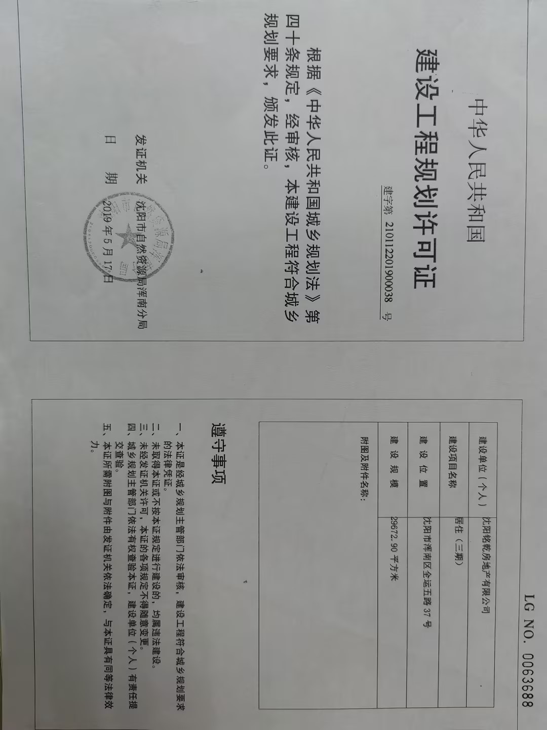 建设工程规划许可证号:建字第210112201900038号 发证日期:2019.5.17 项目名称:居住(三期) 建设位置:浑南区,全运五路37号。 建设单位:沈阳铭乾房地产有限公司 公示期限:即日起至该项目规划核实合格止。 联系电话:沈阳市自然资源局浑南分局,024-24222956; 沈阳铭乾房地产有限公司,024-88327888 联系地址:沈阳市浑南新区世纪路15号,邮编:110179 沈阳铭乾房地产有限公司 沈阳市自然资源局浑南分局 监制 2019年5月17日