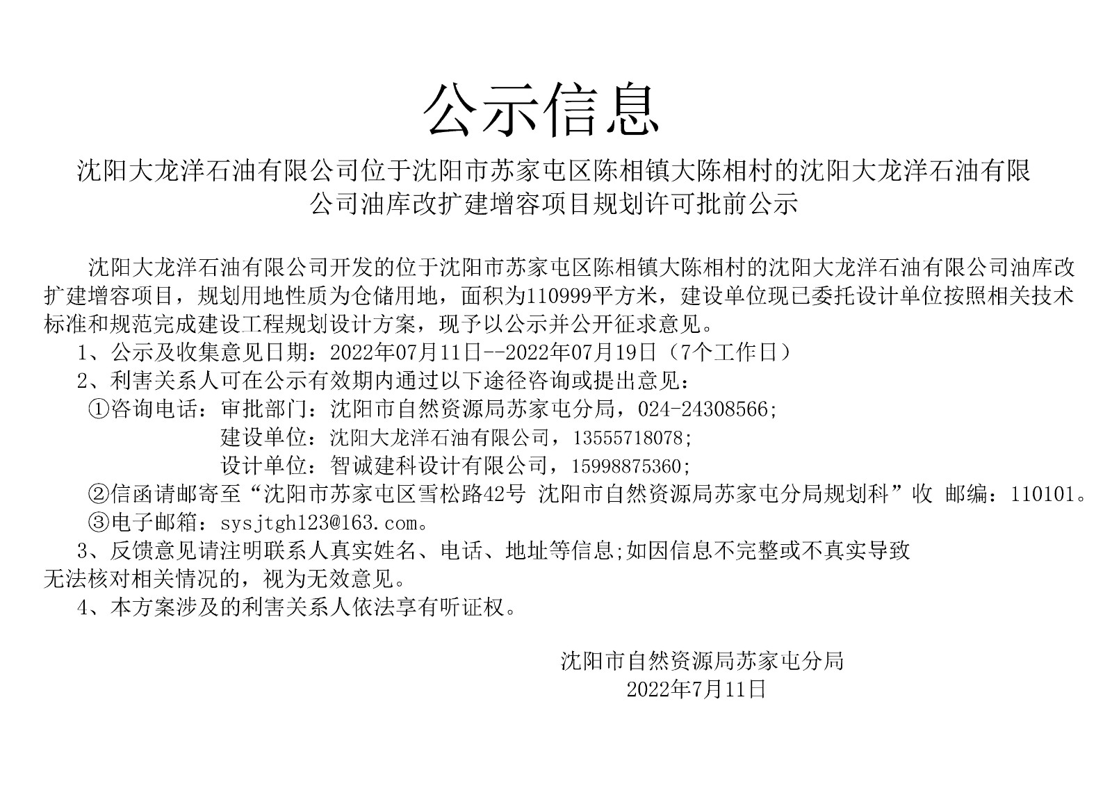 沈阳大龙洋石油有限公司位于苏家屯区大陈相村油库改扩建项目批前公示
